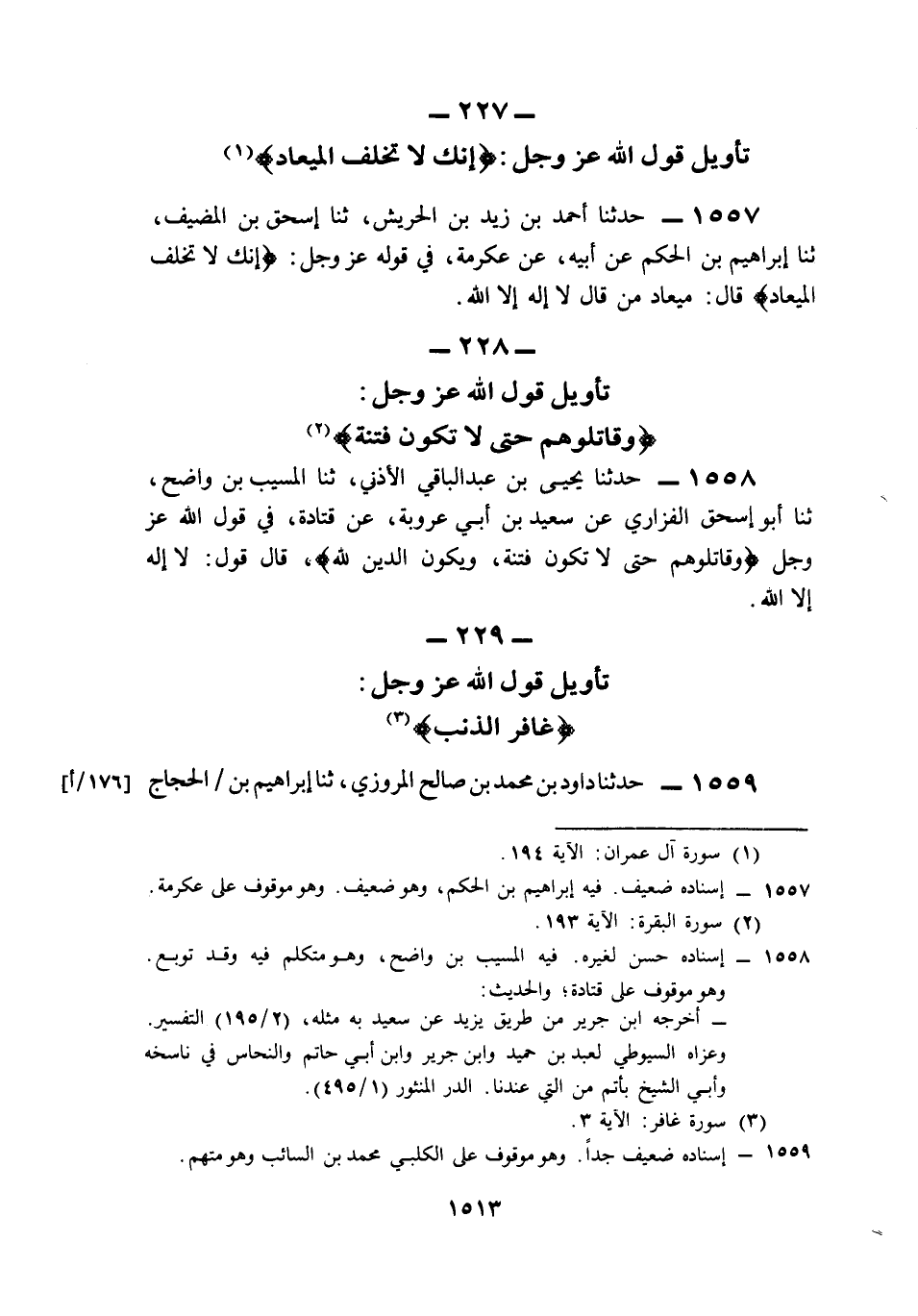 1557- حَدَّثَنَا أَحْمَدُ بْنُ زَيْدِ بْنِ الْحَرِيشِ، حَدَّثَنَا إِسْحَاقُ بْنُ الضَّيْفِ (1)، حَدَّثَنَا إِبْرَاهِيمُ بْنُ الْحَكَمِ، عَنْ أَبِيهِ، عَنْ عِكْرِمَةَ، فِي قَوْلِهِ عَزَّ وَجَلَّ: {إِنَّكَ لاَ تُخْلِفُ الْمِيعَادَ} قَالَ: مِيعَادَ مَنْ قَالَ: لاَ إِلَهَ إِلاَّ اللَّهُ.