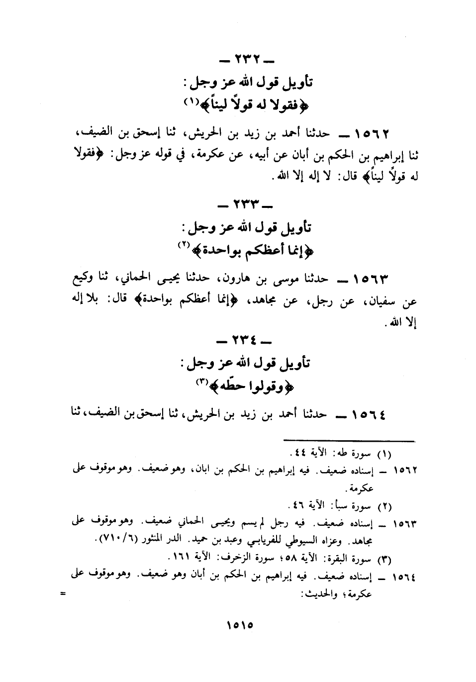 1564- حَدَّثَنَا أَحْمَدُ بْنُ زَيْدِ بْنِ الْحَرِيشِ، حَدَّثَنَا إِسْحَاقُ بْنُ الضَّيْفِ، حَدَّثَنَا إِبْرَاهِيمُ بْنُ الْحَكَمِ بْنِ أَبَانَ، عَنْ أَبِيهِ، عَنْ عِكْرِمَةَ، فِي قَوْلِهِ عَزَّ وَجَلَّ: {وَقُولُوا حِطَّةٌ} قَالَ: لاَ إِلَهَ إِلاَّ اللَّهُ.