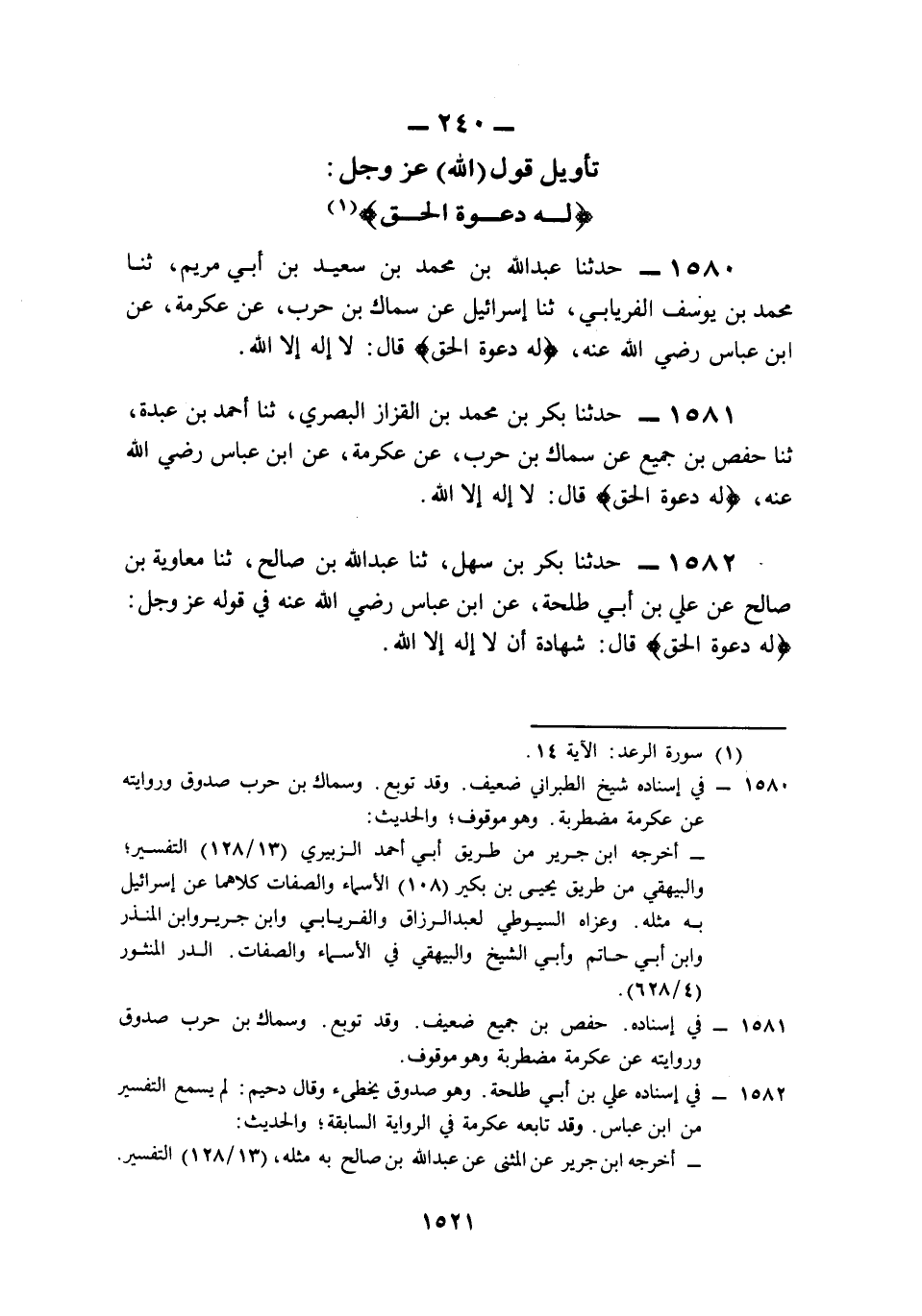 1580- حَدَّثَنَا عَبْدُ اللهِ بْنُ مُحَمَّدِ بْنِ سَعِيدِ بْنِ أَبِي مَرْيَمَ، حَدَّثَنَا مُحَمَّدُ بْنُ يُوسُفَ الْفِرْيَابِيُّ، حَدَّثَنَا إِسْرَائِيلُ، عَنْ سِمَاكِ بْنِ حَرْبٍ، عَنْ عِكْرِمَةَ، عَنِ ابْنِ عَبَّاسٍ، رَضِيَ اللَّهُ عَنْهُ: {لَهُ دَعْوَةُ الْحَقِّ} قَالَ: لاَ إِلَهَ إِلاَّ اللَّهُ.