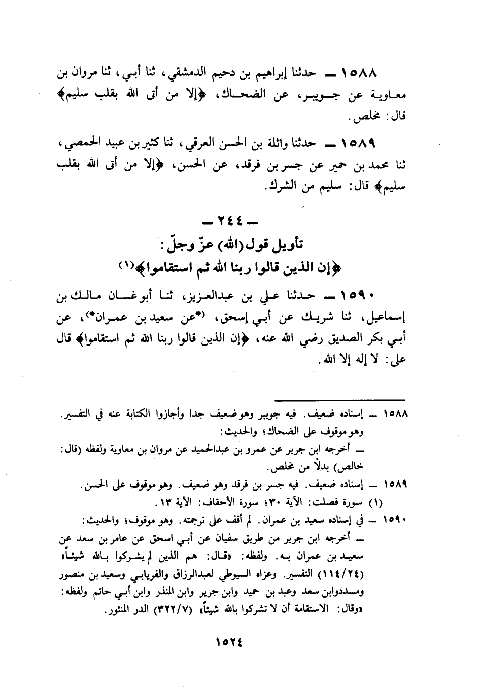 1588- حَدَّثَنَا إِبْرَاهِيمُ بْنُ دُحَيْمٍ الدِّمَشْقِيُّ، حَدَّثَنَا أَبِي، حَدَّثَنَا مَرْوَانُ بْنُ مُعَاوِيَةَ، عَنْ جُوَيْبِرٍ، عَنِ الضَّحَّاكِ، {إِلاَّ مَنْ أَتَى اللَّهَ بِقَلْبٍ سَلِيمٍ} قَالَ: مُخْلِصٍ.