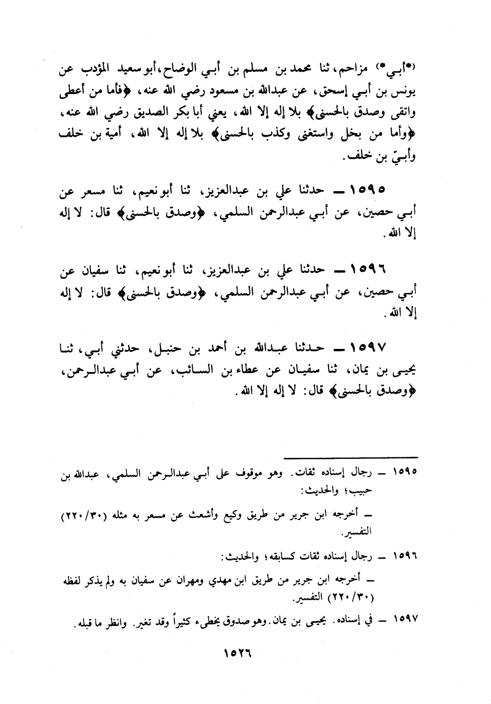 1596- حَدَّثَنَا عَلِيُّ بْنُ عَبْدِ الْعَزِيزِ، حَدَّثَنَا أَبُو نُعَيْمٍ، حَدَّثَنَا سُفْيَانُ، عَنْ أَبِي حَصِينٍ، عَنْ أَبِي عَبْدِ الرَّحْمَنِ السُّلَمِيِّ، {وَصَدَّقَ بِالْحُسْنَى} قَالَ: لاَ إِلَهَ إِلاَّ اللَّهُ.