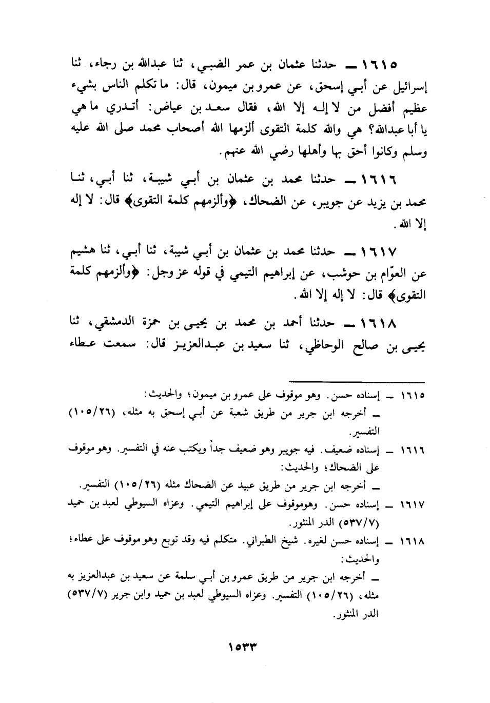 1616- حَدَّثَنَا مُحَمَّدُ بْنُ عُثْمَانَ بْنِ أَبِي شَيْبَةَ، حَدَّثَنَا أَبِي، حَدَّثَنَا مُحَمَّدُ بْنُ يَزِيدَ، عَنْ جُوَيْبِرٍ، عَنِ الضَّحَّاكِ، {وَأَلْزَمَهُمْ كَلِمَةَ التَّقْوَى} قَالَ: لاَ إِلَهَ إِلاَّ اللَّهُ.