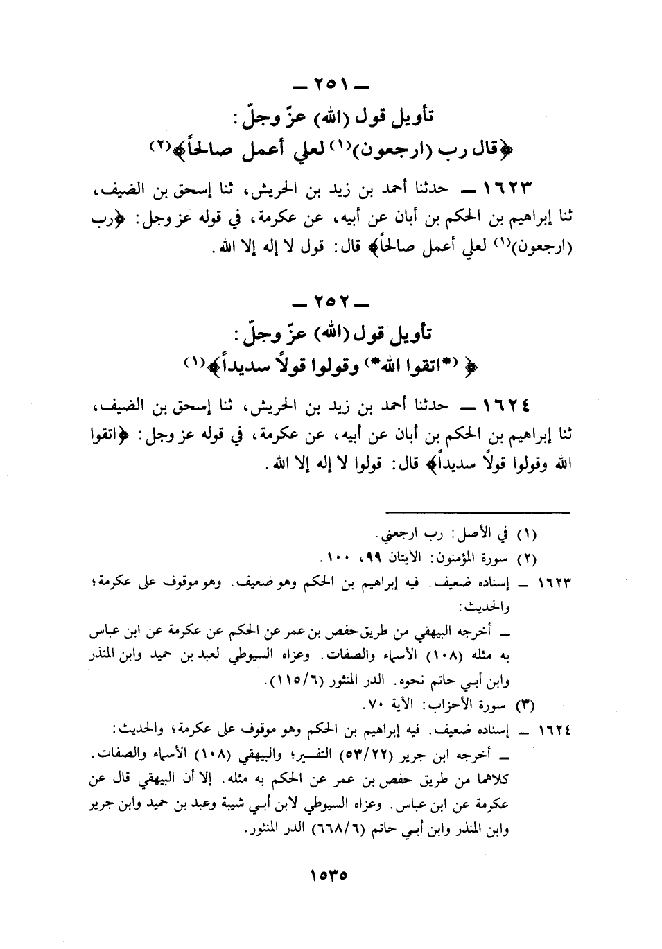 1623- حَدَّثَنَا أَحْمَدُ بْنُ زَيْدِ بْنِ الْحَرِيشِ، حَدَّثَنَا إِسْحَاقُ بْنُ الضَّيْفِ، حَدَّثَنَا إِبْرَاهِيمُ بْنُ الْحَكَمِ بْنِ أَبَانَ، عَنْ أَبِيهِ، عَنْ عِكْرِمَةَ، فِي قَوْلِهِ عَزَّ وَجَلَّ: {رَبِّ ارْجِعُونِ لَعَلِّي أَعْمَلُ صَالِحًا} قَالَ: قَوْلُ لاَ إِلَهَ إِلاَّ اللَّهُ.