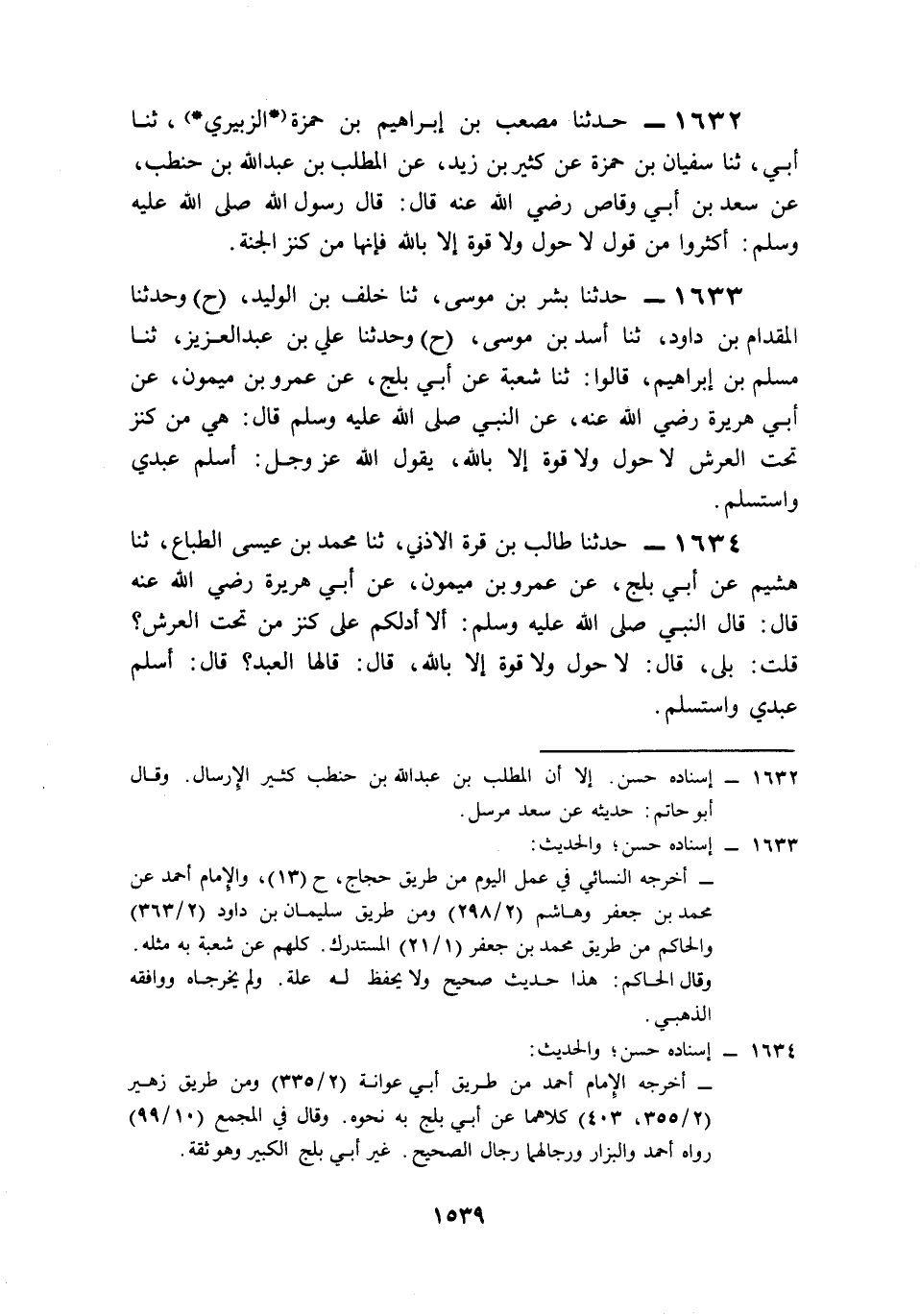 1632- حَدَّثَنَا مُصْعَبُ بْنُ إِبْرَاهِيمَ بْنِ حَمْزَةَ الزُّبَيْرِيُّ، حَدَّثَنَا أَبِي، حَدَّثَنَا سُفْيَانُ بْنُ حَمْزَةَ، عَنْ كَثِيرِ بْنِ زَيْدٍ، عَنِ الْمُطَّلِبِ بْنِ عَبْدِ اللهِ بْنِ حَنْطَبٍ، عَنْ سَعْدِ بْنِ أَبِي وَقَّاصٍ، رَضِيَ اللَّهُ عَنْهُ قَالَ: قَالَ رَسُولُ اللهِ صَلى الله عَلَيه وَسَلم: أَكْثِرُوا مِنْ قَوْلِ لاَ حَوْلَ وَلاَ قُوَّةَ إِلاَّ بِاللهِ, فَإِنَّهَا مِنْ كَنْزِ الْجَنَّةِ.