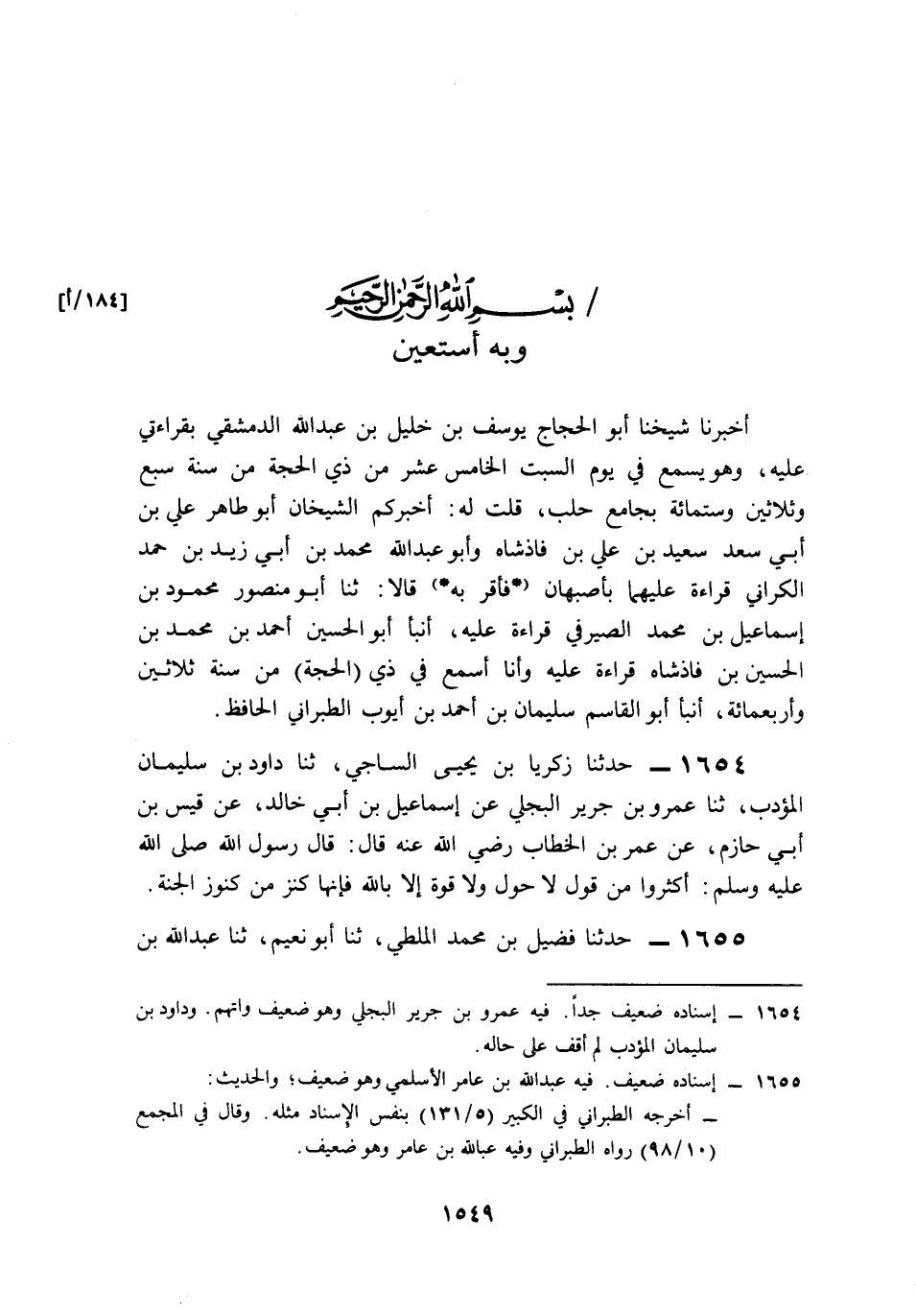 - أَخَبْرَنَا شَيْخُنَا أَبُو الْحَجَّاجِ يُوسُفُ بْنُ خَلِيلِ بْنِ عَبْدِ اللهِ الدِّمَشْقِيُّ بِقِرَاءَتِي عَلَيْهِ وَهُوَ يَسْمَعُ فِي يَوْمِ السَّبْتِ, الْخَامِسَ عَشَرَ مِنْ ذِي الْحِجَّةِ, مِنْ سَنَةِ سَبْعٍ وَثَلاَثِينَ وَسِتِّمِئَةٍ بِجَامِعِ حَلَبَ, قُلْتُ لَهُ: أَخْبَرَكُمُ الشَّيْخَانِ: أَبُو طَاهِرٍ عَلِيُّ بْنُ أَبِي سَعْدٍ سَعِيدُ بْنُ عَلِيِّ بْنِ فَاذَشَاهْ، وَأَبُو عَبْدِ اللهِ مُحَمَّدُ بْنُ أَبِي زَيْدِ بْنِ حَمَدٍ الْكُرَانِيُّ قِرَاءَةً عَلَيْهِمَا بِأَصْبَهَانَ, فَأَقَرَّ بِهِ, قَالاَ: حدثَنَا أَبُو مَنْصُورٍ مَحْمُودُ بْنُ إِسْمَاعِيلَ بْنِ مُحَمَّدِ الصَّيْرَفِيِّ قِرَاءَةً عَلَيْهِ، أَخْبَرَنَا أَبُو الْحُسَيْنِ أَحْمَدُ بْنُ مُحَمَّدِ بْنِ الْحُسَيْنِ بْنِ فَاذَشَاهْ قِرَاءَةً عَلَيْهِ وَأَنَا أَسْمَعُ فِي ذِي الْحِجَّةِ, مِنْ سَنَةِ ثَلاَثِينَ وَأَرْبَعِمِئَةٍ، أَخْبَرَنَا أَبُو الْقَاسِمِ سُلَيْمَانُ بْنٌ أَحْمَدَ بْنِ أَيُّوبَ الطَّبَرَانِيُّ الْحَافِظُ.