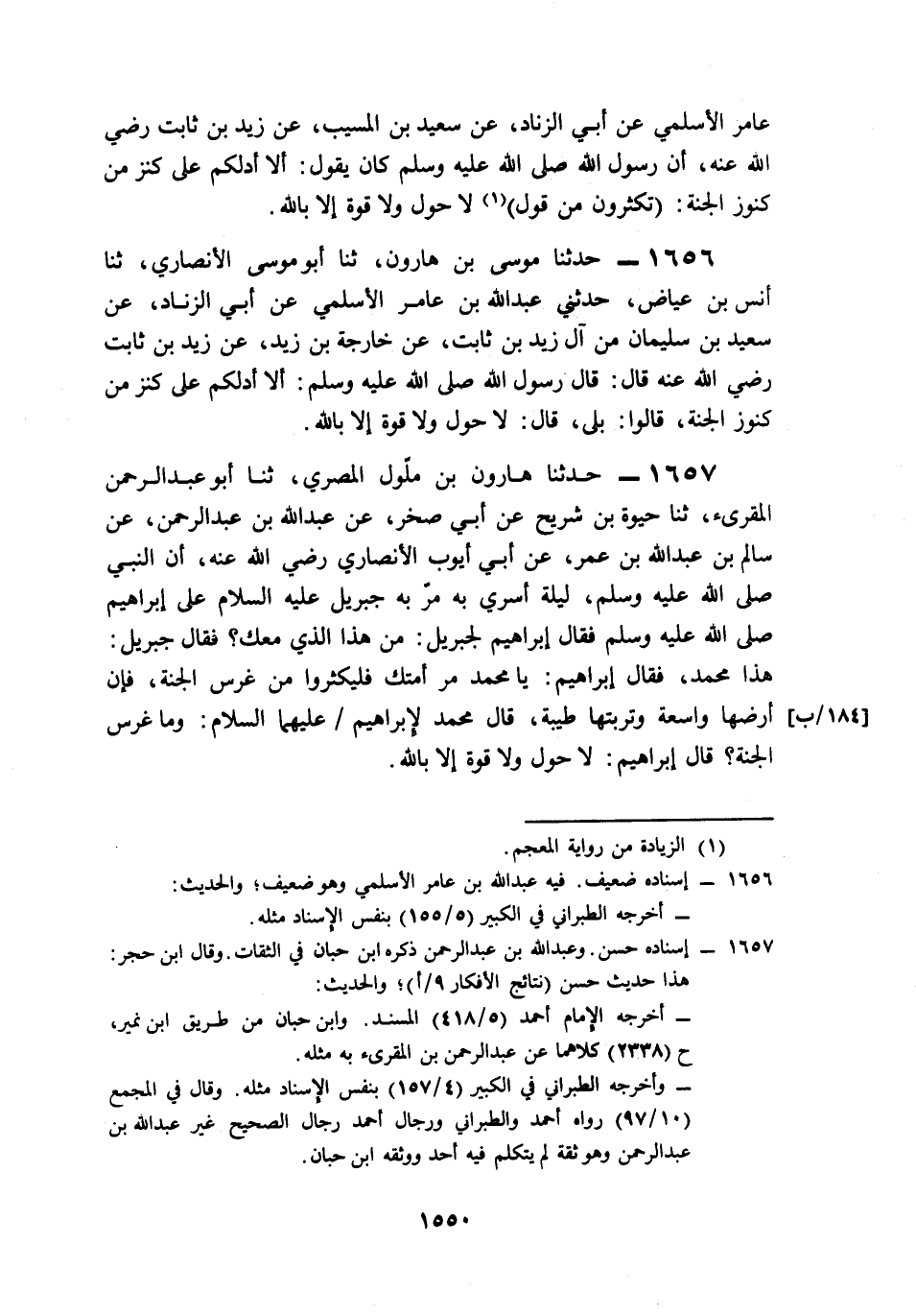 1657- حَدَّثَنَا هَارُونُ بْنُ مَلُّولٍ الْمِصْرِيُّ، حَدَّثَنَا أَبُو عَبْدِ الرَّحْمَنِ الْمُقْرِئُ، حَدَّثَنَا حَيْوَةُ بْنُ شُرَيْحٍ، عَنْ أَبِي صَخْرٍ، عَنْ عَبْدِ اللهِ بْنِ عَبْدِ الرَّحْمَنِ، عَنْ سَالِمِ بْنِ عَبْدِ اللهِ بْنِ عُمَرَ، عَنْ أَبِي أَيُّوبَ الأَنْصَارِيِّ، رَضِيَ اللَّهُ عَنْهُ, أَنَّ النَّبِيَّ صَلى الله عَلَيه وَسَلم لَيْلَةَ أُسْرِيَ بِهِ, مَرَّ بِهِ جِبْرِيلُ عَلَيْهِ السَّلاَمُ عَلَى إِبْرَاهِيمَ صَلى الله عَلَيه وَسَلم, فَقَالَ إِبْرَاهِيمُ لِجِبْرِيلَ: مَنْ هَذَا الَّذِي مَعَكَ؟ فَقَالَ جِبْرِيلُ: هَذَا مُحَمَّدٌ، فَقَالَ إِبْرَاهِيمُ: يَا مُحَمَّدُ, مُرْ أُمَّتَكَ فَلْيُكْثِرُوا مِنْ غَرْسِ الْجَنَّةِ, فَإِنَّ أَرْضَهَا وَاسِعَةٌ، وَتُرْبَتُهَا طَيِّبَةٌ، قَالَ مُحَمَّدٌ لِإِبْرَاهِيمَ عَلَيْهِمَا السَّلاَمُ: وَمَا غَرْسُ الْجَنَّةِ؟ قَالَ إِبْرَاهِيمُ: لاَ حَوْلَ وَلاَ قُوَّةَ إِلاَّ بِاللهِ.