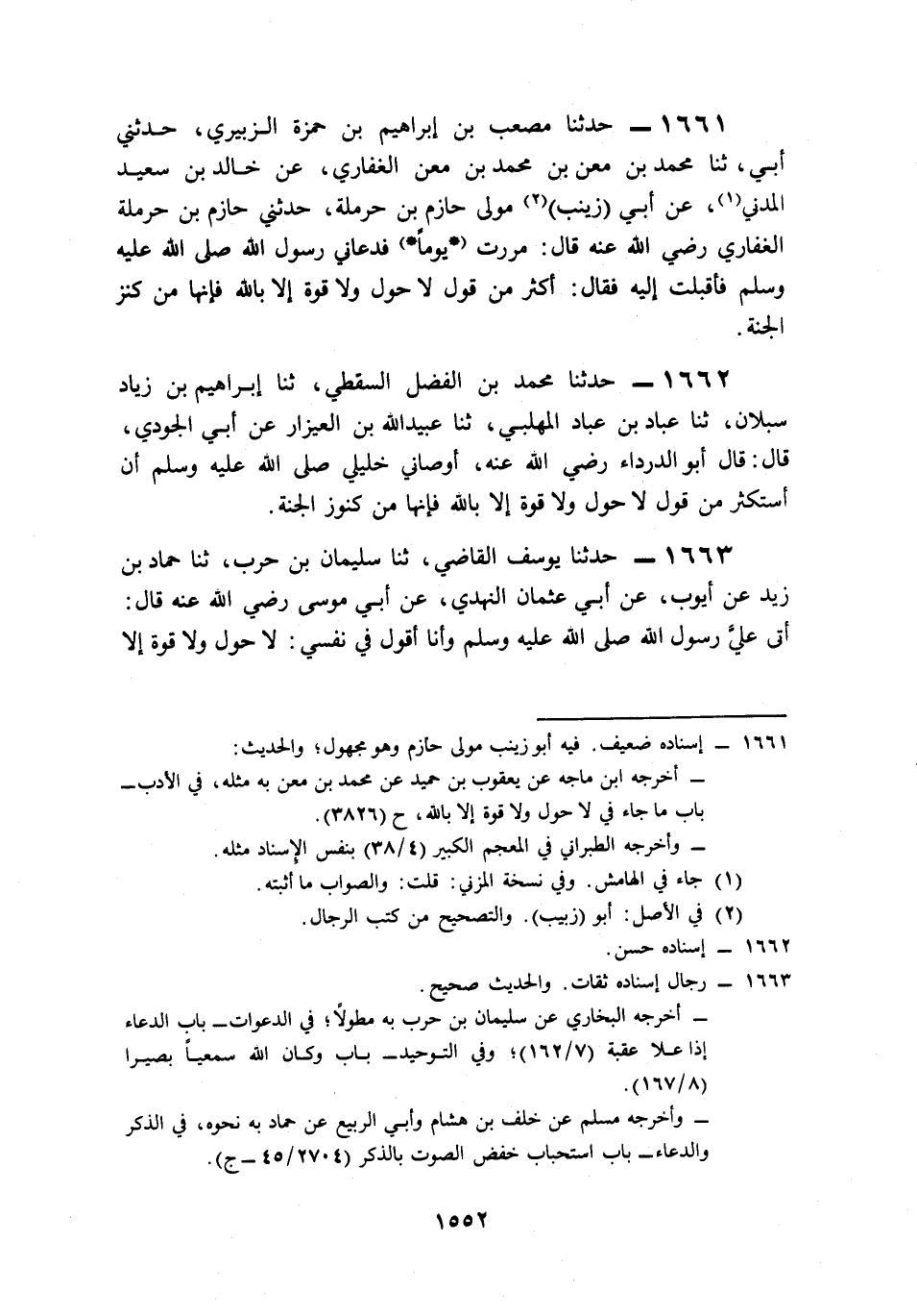 1661- حَدَّثَنَا مُصْعَبُ بْنُ إِبْرَاهِيمَ بْنِ حَمْزَةَ الزُّبَيْرِيُّ، حَدَّثَنِي أَبِي، حَدَّثَنَا مُحَمَّدُ بْنُ مَعْنِ بْنِ مُحَمَّدِ بْنِ مَعْنٍ الْغِفَارِيُّ، عَنْ خَالِدِ بْنِ سَعِيدٍ الْمَدَنِيِّ، عَنْ أَبِي زَيْنَبَ، مَوْلَى حَازِمِ بْنِ حَرْمَلَةَ، حَدَّثَنِي حَازِمُ بْنُ حَرْمَلَةَ الْغِفَارِيُّ، رَضِيَ اللَّهُ عَنْهُ قَالَ: مَرَرْتُ يَوْمًا, فَدَعَانِي رَسُولُ اللهِ صَلى الله عَلَيه وَسَلم فَأَقْبَلْتُ إِلَيْهِ, فَقَالَ: أَكْثِرْ مِنْ قَوْلِ لاَ حَوْلَ وَلاَ قُوَّةَ إِلاَّ بِاللهِ, فَإِنَّهَا مِنْ كَنْزِ الْجَنَّةِ.