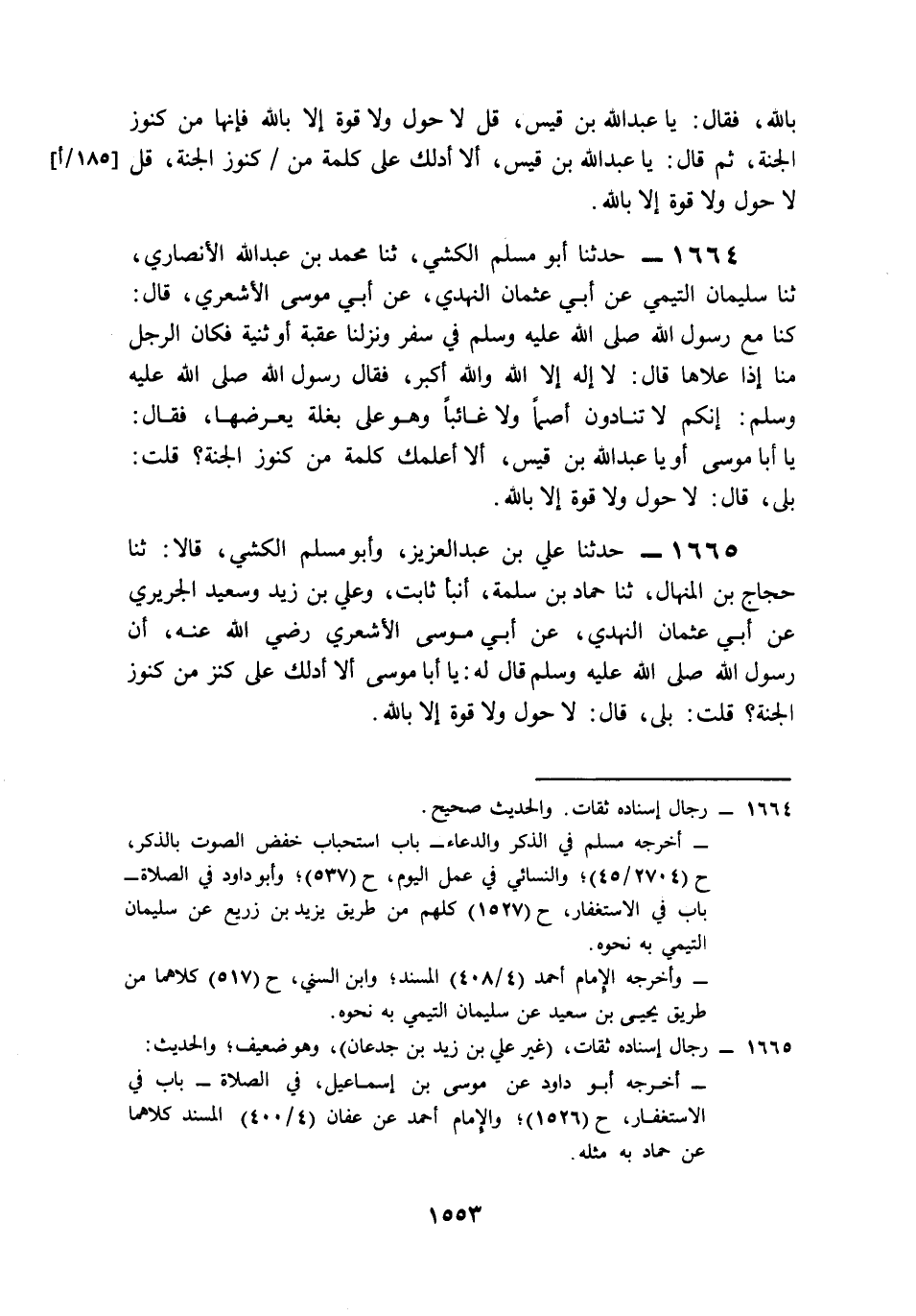 1664- حَدَّثَنَا أَبُو مُسْلِمٍ الْكَشِّيُّ، حَدَّثَنَا مُحَمَّدُ بْنُ عَبْدِ اللهِ الأَنْصَارِيُّ، حَدَّثَنَا سُلَيْمَانُ التَّيْمِيُّ، عَنْ أَبِي عُثْمَانَ النَّهْدِيِّ، عَنْ أَبِي مُوسَى الأَشْعَرِيِّ، قَالَ: كُنَّا مَعَ رَسُولِ اللهِ صَلى الله عَلَيه وَسَلم فِي سَفَرٍ, وَنَزَلْنَا عَقَبَةً, أَوْ ثَنِيَّةً, فَكَانَ الرَّجُلُ مِنَّا إِذَا عَلاَهَا قَالَ: لاَ إِلَهَ إِلاَّ اللَّهُ وَاللَّهُ أَكْبَرُ، فَقَالَ رَسُولُ اللهِ صَلى الله عَلَيه وَسَلم: إِنَّكُمْ لاَ تُنَادُونَ أَصَمًّا وَلاَ غَائِبًا, وَهُوَ عَلَى بَغْلَةٍ يَعْرِضُهَا, فَقَالَ: يَا أَبَا مُوسَى, أَوْ يَا عَبْدَ اللهِ بْنَ قَيْسٍ, أَلاَ أُعَلِّمُكَ كَلِمَةً مِنْ كُنُوزِ الْجَنَّةِ؟ قُلْتُ: بَلَى، قَالَ: لاَ حَوْلَ وَلاَ قُوَّةَ إِلاَّ بِاللهِ.