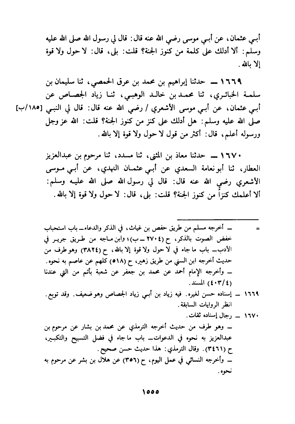 1670- حَدَّثَنَا مُعَاذُ بْنُ الْمُثَنَّى، حَدَّثَنَا مُسَدَّدٌ، حَدَّثَنَا مَرْحُومُ بْنُ عَبْدِ الْعَزِيزِ الْعَطَّارُ، حَدَّثَنَا أَبُو نَعَامَةَ السَّعْدِيُّ، عَنْ أَبِي عُثْمَانَ النَّهْدِيِّ، عَنْ أَبِي مُوسَى الأَشْعَرِيِّ، رَضِيَ اللَّهُ عَنْهُ قَالَ: قَالَ لِي رَسُولُ اللهِ صَلى الله عَلَيه وَسَلم: أَلاَ أُعَلِّمُكَ كَنْزًا مِنْ كُنُوزِ الْجَنَّةِ؟ قُلْتُ: بَلَى، قَالَ: لاَ حَوْلَ وَلاَ قُوَّةَ إِلاَّ بِاللهِ.