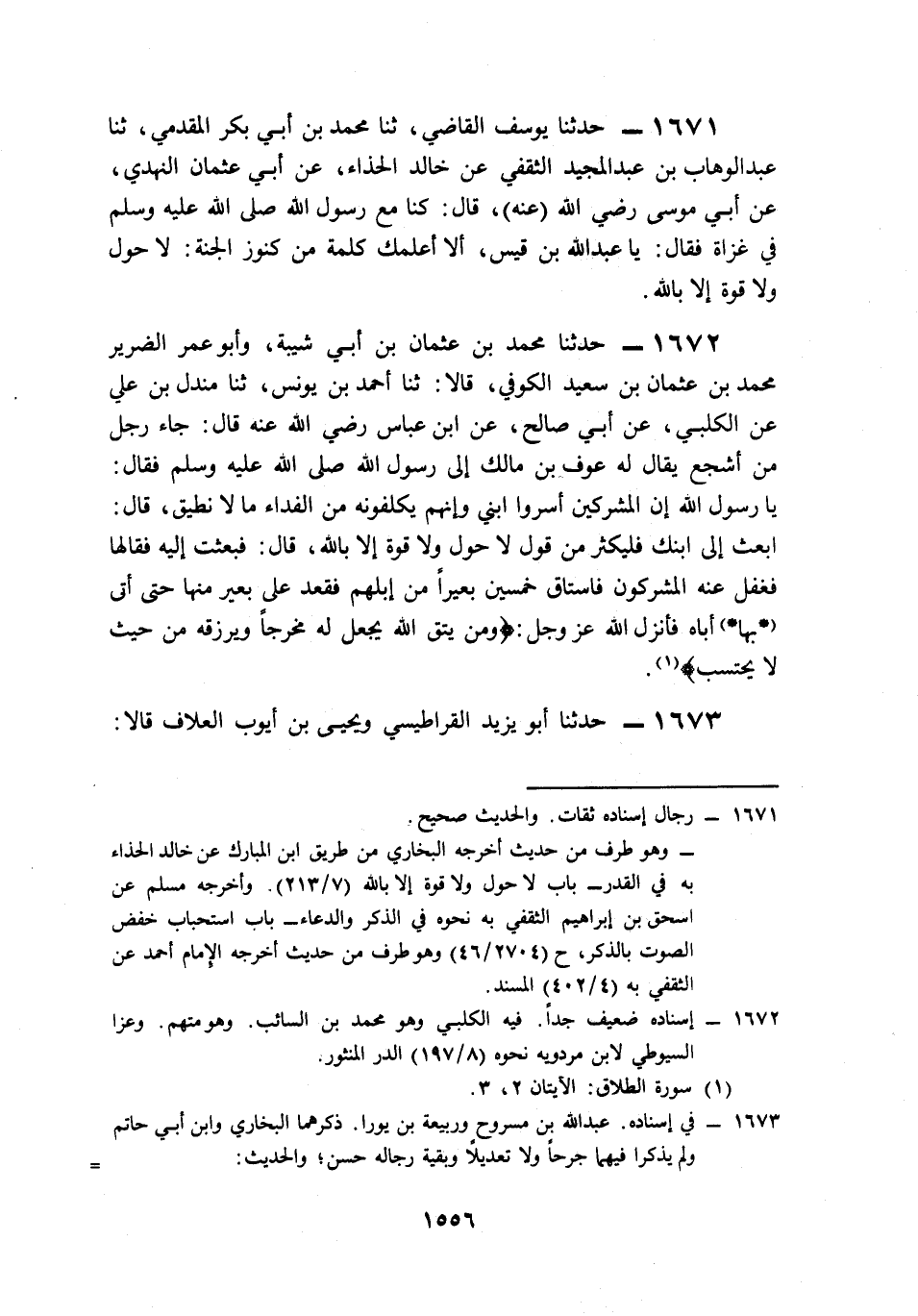1672- حَدَّثَنَا مُحَمَّدُ بْنُ عُثْمَانَ بْنِ أَبِي شَيْبَةَ، وَأَبُو عُمَرَ الضَّرِيرُ مُحَمَّدُ بْنُ عُثْمَانَ بْنِ سَعِيدٍ الْكُوفِيُّ, قَالاَ: حَدَّثَنَا أَحْمَدُ بْنُ يُونُسَ، حَدَّثَنَا مِنْدَلُ بْنُ عَلِيٍّ، عَنِ الْكَلْبِيِّ، عَنْ أَبِي صَالِحٍ، عَنِ ابْنِ عَبَّاسٍ، رَضِيَ اللَّهُ عَنْهُ قَالَ: جَاءَ رَجُلٌ مِنْ أَشْجَعَ, يُقَالُ لَهُ: عَوْفُ بْنُ مَالِكٍ إِلَى رَسُولِ اللهِ صَلى الله عَلَيه وَسَلم فَقَالَ: يَا رَسُولَ اللهِ, إِنَّ الْمُشْرِكِينَ أَسَرُوا ابْنِي, وَإِنَّهُمْ يُكَلِّفُونَهُ مِنَ الْفِدَاءِ مَا لاَ نُطِيقُ، قَالَ: ابْعَثْ إِلَى ابْنِكَ, فَلْيُكْثِرْ مِنْ قَوْلِ: لاَ حَوْلَ وَلاَ قُوَّةَ إِلاَّ بِاللهِ, قَالَ: فَبَعَثْتُ إِلَيْهِ, فَقَالَهَا، فَغَفَلَ عَنْهُ الْمُشْرِكُونَ، فَاسْتَاقَ خَمْسِينَ بَعِيرًا مِنْ إِبِلِهِمْ, فَقَعَدَ عَلَى بَعِيرٍ مِنْهَا, حَتَّى أَتَى بِهَا أَبَاهُ، فَأَنْزَلَ اللَّهُ عَزَّ وَجَلَّ: {وَمَنْ يَتَّقِ اللَّهَ يَجْعَلْ لَهُ مَخْرَجًا وَيَرْزُقْهُ مِنْ حَيْثُ لاَ يَحْتَسِبُ}.