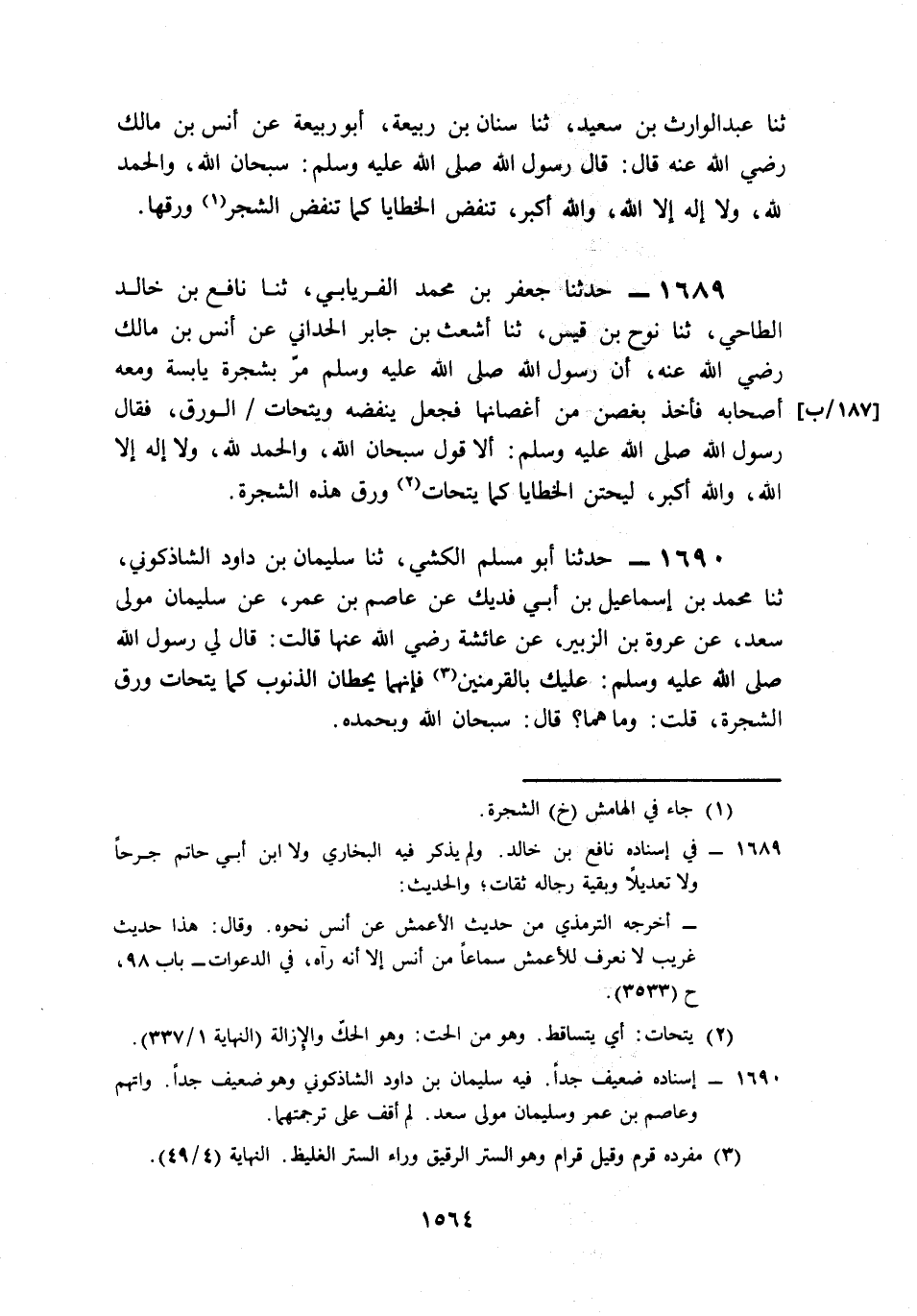 1689- حَدَّثَنَا جَعْفَرُ بْنُ مُحَمَّدٍ الْفِرْيَابِيُّ، حَدَّثَنَا نَافِعُ بْنُ خَالِدٍ الطَّاحِيُّ، حَدَّثَنَا نُوحُ بْنُ قَيْسٍ، حَدَّثَنَا أَشْعَثُ بْنُ جَابِرٍ الْحُدَّانِيُّ، عَنْ أَنَسِ بْنِ مَالِكٍ، رَضِيَ اللَّهُ عَنْهُ, أَنَّ رَسُولَ اللهِ صَلى الله عَلَيه وَسَلم مَرَّ بِشَجَرَةٍ يَابِسَةٍ وَمَعَهُ أَصْحَابُهُ, فَأَخَذَ بِغُصْنٍ مِنْ أَغْصَانِهَا, فَجَعَلَ يَنْفُضُهُ, وَيَتَحَاتُّ الْوَرِقَ, فَقَالَ رَسُولُ اللهِ صَلى الله عَلَيه وَسَلم: أَلاَ قَوْلُ سُبْحَانَ اللهِ، وَالْحَمْدُ لِلَّهِ، وَلاَ إِلَهَ إِلاَّ اللَّهُ، وَاللَّهُ أَكْبَرُ, لَيُحَتَّنَّ الْخَطَايَا كَمَا يَتَحَاتُّ وَرِقُ هَذِهِ الشَّجَرَةِ.