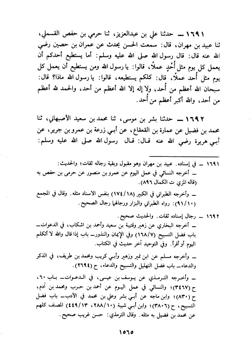 1691- حَدَّثَنَا عَلِيُّ بْنُ عَبْدِ الْعَزِيزِ، حَدَّثَنَا حَرَمِيُّ بْنُ حَفْصٍ الْقَسْمَلِيُّ، حَدَّثَنَا عُبَيْدُ بْنُ مِهْرَانَ، قَالَ: سَمِعْتُ الْحَسَنَ، يُحَدِّثُ عَنْ عِمْرَانَ بْنِ حُصَيْنٍ، رَضِيَ اللَّهُ عَنْهُ قَالَ: قَالَ رَسُولُ اللهِ صَلى الله عَلَيه وَسَلم: أَمَا يَسْتَطِيعُ أَحَدُكُمْ أَنْ يَعْمَلَ كُلَّ يَوْمٍ مِثْلَ أُحُدٍ عَمَلاً؟ قَالُوا: يَا رَسُولَ اللهِ, وَمَنْ يَسْتَطِيعُ أَنْ يَعْمَلَ كُلَّ يَوْمٍ مِثْلَ أُحُدٍ عَمَلاً؟ قَالَ: كُلُّكُمْ يَسْتَطِيعُهُ, قَالُوا: يَا رَسُولَ اللهِ, مَاذَا؟ قَالَ: سُبْحَانَ اللهِ أَعْظَمُ مِنْ أُحُدٍ، وَلاَ إِلَهَ إِلاَّ اللَّهُ أَعْظَمُ مِنْ أُحُدٍ، وَالْحَمْدُ لِلَّهِ أَعْظَمُ مِنْ أُحُدٍ، وَاللَّهُ أَكْبَرُ أَعْظَمُ مِنْ أُحُدٍ.