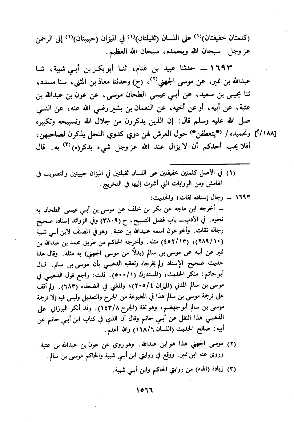 1693- حَدَّثَنَا عُبَيْدُ بْنُ غَنَّامٍ، حَدَّثَنَا أَبُو بَكْرِ بْنُ أَبِي شَيْبَةَ، حَدَّثَنَا عَبْدُ اللهِ بْنُ نُمَيْرٍ، عَنْ مُوسَى الْجُهَنِيِّ (ح) وَحَدَّثَنَا مُعَاذُ بْنُ الْمُثَنَّى، حَدَّثَنَا مُسَدَّدٌ، حَدَّثَنَا يَحْيَى بْنُ سَعِيدٍ، عَنْ أَبِي عِيسَى الطَّحَّانِ مُوسَى، عَنْ عَوْنِ بْنِ عَبْدِ اللهِ بْنِ عُتْبَةَ، عَنْ أَبِيهِ, أَوْ عَنْ أَخِيهِ، عَنِ النُّعْمَانِ بْنِ بَشِيرٍ، رَضِيَ اللَّهُ عَنْهُ, عَنِ النَّبِيِّ صَلى الله عَلَيه وَسَلم قَالَ: إِنَّ الَّذِينَ يَذْكُرُونَ مِنْ جَلاَلِ اللهِ وَتَسْبِيحِهِ وَتَكْبِيرِهِ وَتَحْمِيدِهِ, يَتَعَطَّفْنَ حَوْلَ الْعَرْشِ, لَهُنَّ دَوِيُّ كَدَوِيِّ النَّحْلِ, يَذْكُرْنَ لِصَاحِبِهِنَّ، أَفَلاَ يُحِبُّ أَحَدُكُمْ أَنْ لاَ يَزَالَ عِنْدَ اللهِ عَزَّ وَجَلَّ شَيْءٌ يَذْكُرُهُ بِهِ.