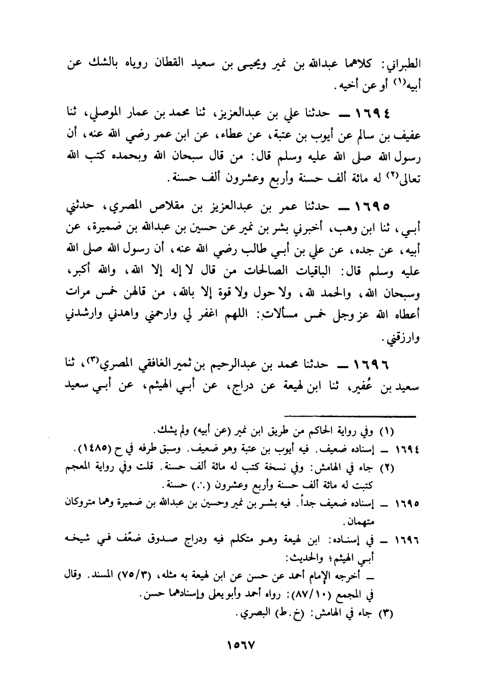 1695- حَدَّثَنَا عُمَرُ بْنُ عَبْدِ الْعَزِيزِ بْنِ مِقْلاَصٍ الْمِصْرِيُّ، حَدَّثَنِي أَبِي، حَدَّثَنَا ابْنُ وَهْبٍ، أَخْبَرَنِي بِشْرُ بْنُ نُمَيْرٍ، عَنْ حُسَيْنِ بْنِ عَبْدِ اللهِ بْنِ ضُمَيْرَةَ، عَنْ أَبِيهِ، عَنْ جَدِّهِ، عَنْ عَلِيِ بْنِ أَبِي طَالِبٍ، رَضِيَ اللَّهُ عَنْهُ, أَنَّ رَسُولَ اللهِ صَلى الله عَلَيه وَسَلم قَالَ: الْبَاقِيَاتُ الصَّالِحَاتُ مَنْ قَالَ لاَ إِلَهَ إِلاَّ اللَّهُ، وَاللَّهُ أَكْبَرُ، وَسُبْحَانَ اللهِ، وَالْحَمْدُ لِلَّهِ، وَلاَ حَوْلَ وَلاَ قُوَّةَ إِلاَّ بِاللهِ, مَنْ قَالَهُنَّ خَمْسَ مَرَّاتٍ أَعْطَاهُ اللَّهُ عَزَّ وَجَلَّ خَمْسَ مَسْأَلاَتٍ: اللَّهُمَّ اغْفِرْ لِي، وَارْحَمْنِي، وَاهْدِنِي، وَأَرْشِدْنِي، وَارْزُقْنِي.