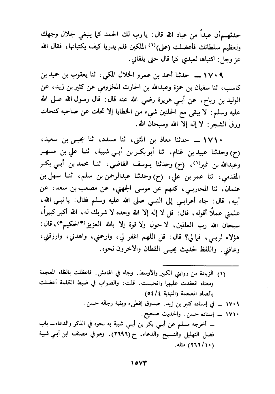 1710- حَدَّثَنَا مُعَاذُ بْنُ الْمُثَنَّى، حَدَّثَنَا مُسَدَّدٌ، حَدَّثَنَا يَحْيَى بْنُ سَعِيدٍ (ح) وَحَدَّثَنَا عُبَيْدُ بْنُ غَنَّامٍ، حَدَّثَنَا أَبُو بَكْرِ بْنُ أَبِي شَيْبَةَ، حَدَّثَنَا عَلِيُّ بْنُ مُسْهِرٍ، وَعَبْدُ اللهِ بْنِ نُمَيْرٍ (ح) وَحَدَّثَنَا يُوسُفُ الْقَاضِي، حَدَّثَنَا مُحَمَّدُ بْنُ أَبِي بَكْرٍ الْمُقَدَّمِيُّ، حَدَّثَنَا عُمَرُ بْنُ عَلِيٍّ (ح) وَحَدَّثَنَا عَبْدُ الرَّحْمَنِ بْنُ سَلْمٍ، حَدَّثَنَا سَهْلُ بْنُ عُثْمَانَ، حَدَّثَنَا الْمُحَارِبِيُّ، كُلُّهُمْ عَنْ مُوسَى الْجُهَنِيُّ، عَنْ مُصْعَبِ بْنِ سَعْدٍ، عَنْ أَبِيهِ، قَالَ: جَاءَ أَعْرَابِيُّ إِلَى النَّبِيِّ صَلى الله عَلَيه وَسَلم فَقَالَ: يَا نَبِيَّ اللهِ, عَلِّمْنِي عَمَلاً أَقُولُهُ, قَالَ: قُلْ: لاَ إِلَهَ إِلاَّ اللَّهُ وَحْدَهُ، لاَ شَرِيكَ لَهُ، اللَّهُ أَكْبَرُ كَبِيرًا، سُبْحَانَ اللهِ رَبِّ الْعَالَمِينَ، لاَ حَوْلَ وَلاَ قُوَّةَ إِلاَّ بِاللهِ الْعَزِيزِ الْحَكِيمِ, قَالَ: هَؤُلاَءِ لِرَبِّي، فَمَا لِي؟ قَالَ: قُلِ: اللَّهُمَّ اغْفِرْ لِي، وَارْحَمْنِي، وَاهْدِنِي، وَارْزُقْنِي، وَعَافِنِي.