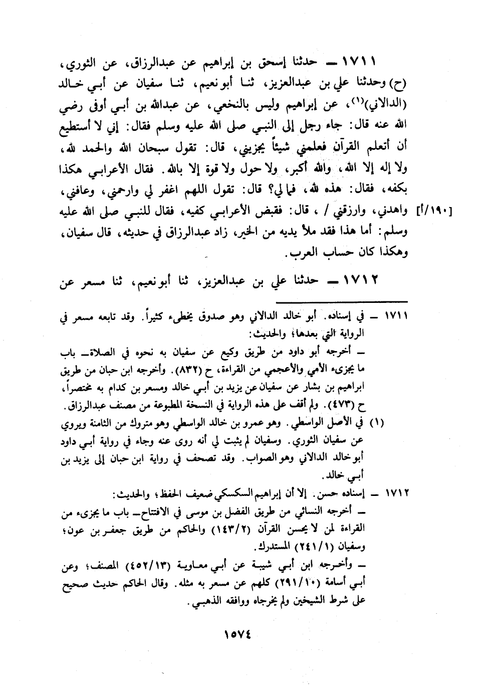 1711- حَدَّثَنَا إِسْحَاقُ بْنُ إِبْرَاهِيمَ، عَنْ عَبْدِ الرَّزَّاقِ، عَنِ الثَّوْرِيِّ (ح) وَحَدَّثَنَا عَلِيُّ بْنُ عَبْدِ الْعَزِيزِ، حَدَّثَنَا أَبُو نُعَيْمٍ، حَدَّثَنَا سُفْيَانُ، عَنْ أَبِي خَالِدٍ الدَّالاَنِيِّ، عَنْ إِبْرَاهِيمَ، وَلَيْسَ بِالنَّخَعِيِّ, عَنْ عَبْدِ اللهِ بْنِ أَبِي أَوْفَى، رَضِيَ اللَّهُ عَنْهُ قَالَ: جَاءَ رَجُلٌ إِلَى النَّبِيِّ صَلى الله عَلَيه وَسَلم فَقَالَ: إِنِّي لاَ أَسْتَطِيعُ أَنْ أَتَعَلَّمَ الْقُرْآنَ, فَعَلِّمْنِي شَيْئًا يُجْزِينِي، قَالَ: تَقُولُ: سُبْحَانَ اللهِ وَالْحَمْدُ لِلَّهِ، وَلاَ إِلَهَ إِلاَّ اللَّهُ، وَاللَّهُ أَكْبَرُ، وَلاَ حَوْلَ وَلاَ قُوَّةَ إِلاَّ بِاللهِ, فَقَالَ الأَعْرَابِيُّ: هَكَذَا بِكَفِّهِ, فَقَالَ: هَذِهِ لِلَّهِ, فَمَا لِي؟ قَالَ: تَقُولُ: اللَّهُمَّ اغْفِرْ لِي وَارْحَمْنِي وَعَافِنِي وَاهْدِنِي وَارْزُقْنِي, قَالَ: فَقَبَضَ الأَعْرَابِيُّ كَفَّيْهِ, فَقَالَ لِلنَّبِيِّ صَلى الله عَلَيه وَسَلم: أَمَّا هَذَا فَقَدْ مَلَأَ يَدَيْهِ مِنَ الْخَيْرِ.