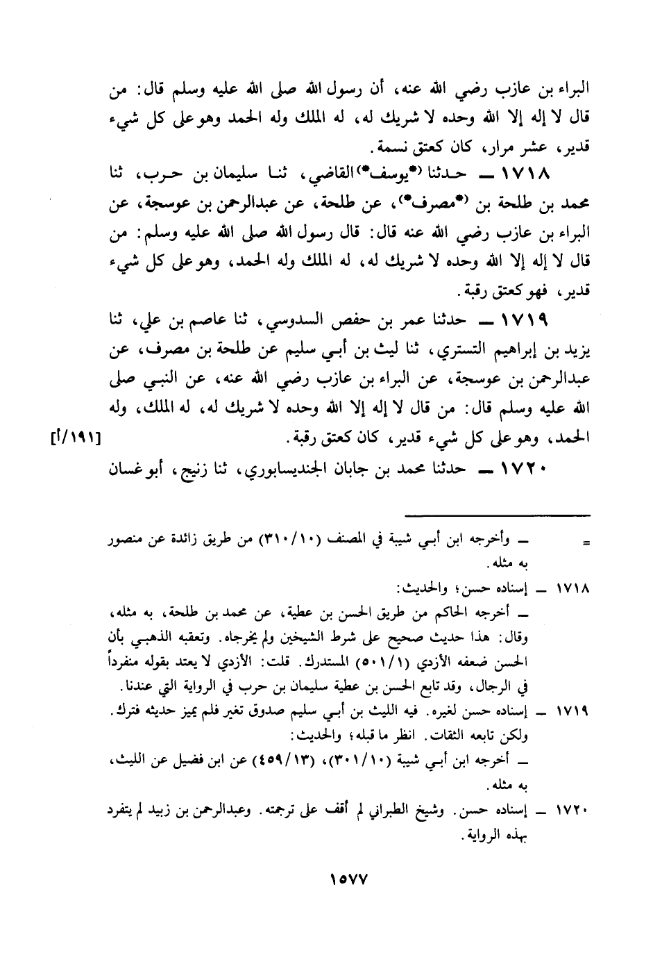 1718- حَدَّثَنَا يُوسُفُ الْقَاضِي، حَدَّثَنَا سُلَيْمَانُ بْنُ حَرْبٍ، حَدَّثَنَا مُحَمَّدُ بْنُ طَلْحَةَ بْنِ مُصَرِّفٍ، عَنْ طَلْحَةَ، عَنْ عَبْدِ الرَّحْمَنِ بْنِ عَوْسَجَةَ، عَنِ الْبَرَاءِ بْنِ عَازِبٍ، رَضِيَ اللَّهُ عَنْهُ قَالَ: قَالَ رَسُولُ اللهِ صَلى الله عَلَيه وَسَلم: مَنْ قَالَ لاَ إِلَهَ إِلاَّ اللَّهُ وَحْدَهُ لاَ شَرِيكَ لَهُ، لَهُ الْمُلْكُ وَلَهُ الْحَمْدُ وَهُوَ عَلَى كُلِّ شَيْءٍ قَدِيرٌ, فَهُوَ كَعِتْقِ رَقَبَةٍ.