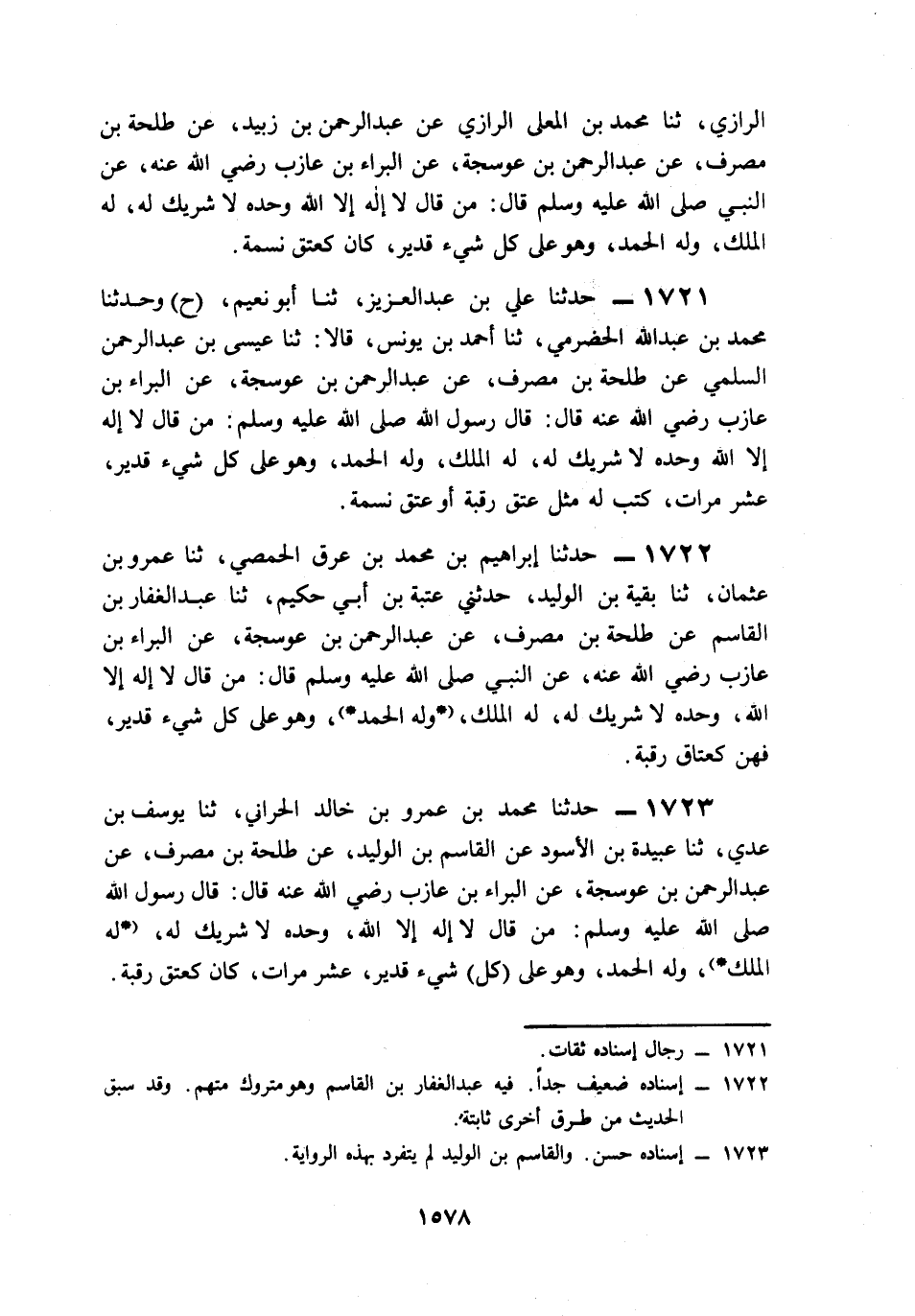 1722- حَدَّثَنَا إِبْرَاهِيمُ بْنُ مُحَمَّدِ بْنِ عِرْقٍ الْحِمْصِيُّ، حَدَّثَنَا عَمْرُو بْنُ عُثْمَانَ، حَدَّثَنَا بَقِيَّةُ بْنُ الْوَلِيدِ، حَدَّثَنِي عُتْبَةُ بْنُ أَبِي حَكِيمٍ، حَدَّثَنَا عَبْدُ الْغَفَّارِ بْنُ الْقَاسِمِ، عَنْ طَلْحَةَ بْنِ مُصَرِّفٍ، عَنْ عَبْدِ الرَّحْمَنِ بْنِ عَوْسَجَةَ، عَنِ الْبَرَاءِ بْنِ عَازِبٍ، رَضِيَ اللَّهُ عَنْهُ, عَنِ النَّبِيِّ صَلى الله عَلَيه وَسَلم قَالَ: مَنْ قَالَ: لاَ إِلَهَ إِلاَّ اللَّهُ وَحْدَهُ لاَ شَرِيكَ لَهُ، لَهُ الْمُلْكُ وَلَهُ الْحَمْدُ وَهُوَ عَلَى كُلِّ شَيْءٍ قَدِيرٌ, فَهُنَّ كَعِتَاقِ رَقَبَةٍ.