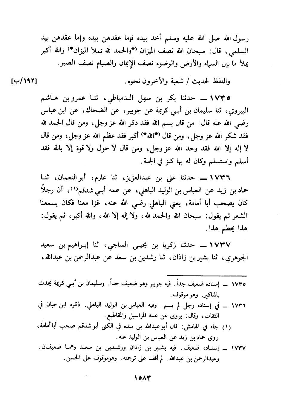 1735- حَدَّثَنَا بَكْرُ بْنُ سَهْلٍ الدِّمْيَاطِيُّ، حَدَّثَنَا عَمْرُو بْنُ هَاشِمِ الْبَيْرُوتِيُّ، حَدَّثَنَا سُلَيْمَانُ بْنُ أَبِي كَرِيمَةَ، عَنْ جُوَيْبِرٍ، عَنِ الضَّحَّاكِ، عَنِ ابْنِ عَبَّاسٍ، رَضِيَ اللَّهُ عَنْهُ قَالَ: مَنْ قَالَ: بِسْمِ اللهِ, فَقَدْ ذَكَرَ اللَّهَ عَزَّ وَجَلَّ وَمَنْ قَالَ: الْحَمْدُ لِلَّهِ, فَقَدْ شَكَرَ اللَّهَ عَزَّ وَجَلَّ، وَمَنْ قَالَ: اللَّهُ أَكْبَرُ, فَقَدْ عَظَّمَ اللَّهُ عَزَّ وَجَلَّ، وَمَنْ قَالَ: لاَ إِلَهَ إِلاَّ اللَّهُ, فَقَدْ وَحَّدَ اللَّهُ عَزَّ وَجَلَّ، وَمَنْ قَالَ: لاَ حَوْلَ وَلاَ قُوَّةَ إِلاَّ بِاللهِ فَقَدْ أَسْلَمَ وَاسْتَسْلَمَ, وَكَانَ لَهُ بِهَا كَنْزٌ فِي الْجَنَّةِ.