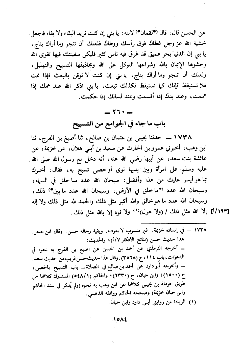1738- حَدَّثَنَا يَحْيَى بْنُ عُثْمَانَ بْنِ صَالِحٍ، حَدَّثَنَا أَصْبَغُ بْنُ الْفَرَجِ، حَدَّثَنَا ابْنُ وَهْبٍ، أَخْبَرَنِي عَمْرُو بْنُ الْحَارِثِ، عَنْ سَعِيدِ بْنِ أَبِي هِلاَلٍ، عَنْ خُزَيْمَةَ، عَنْ عَائِشَةَ بِنْتِ سَعْدٍ، عَنْ أَبِيهَا، رَضِيَ اللَّهُ عَنْهُ, أَنَّهُ دَخَلَ مَعَ رَسُولِ اللهِ صَلى الله عَلَيه وَسَلم عَلَى امْرَأَةٍ وَبَيْنَ يَدَيْهَا نَوًى, أَوْ حَصًى تُسَبِّحُ بِهِ, فَقَالَ: أُخْبِرُكِ بِمَا هُوَ أَيْسَرُ عَلَيْكِ مِنْ هَذَا وَأَفْضَلُ، سُبْحَانَ اللهِ عَدَدَ مَا خَلَقَ فِي السَّمَاءِ، وَسُبْحَانَ اللهِ عَدَدَ مَا خَلَقَ فِي الأَرْضِ، وَسُبْحَانَ اللهِ عَدَدَ مَا بَيْنَ ذَلِكَ، وَسُبْحَانَ اللهِ عَدَدَ مَا هُوَ خَالِقٌ، وَاللَّهُ أَكْبَرُ مِثْلُ ذَلِكَ، وَالْحَمْدُ لِلَّهِ مِثْلُ ذَلِكَ، وَلاَ إِلَهَ إِلاَّ اللَّهُ مِثْلُ ذَلِكَ، وَلاَ حَوْلَ وَلاَ قُوَّةَ إِلاَّ بِاللهِ مِثْلُ ذَلِكَ.