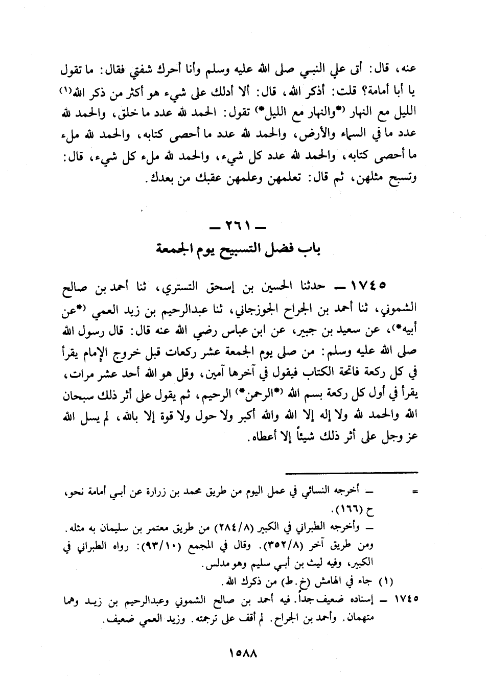 1745- حَدَّثَنَا الْحُسَيْنُ بْنُ إِسْحَاقَ التُّسْتَرِيُّ، حَدَّثَنَا أَحْمَدُ بْنُ صَالِحٍ الشُّمُونِيُّ، حَدَّثَنَا أَحْمَدُ بْنُ الْجَرَّاحِ الْجَوْزَجَانِيُّ، حَدَّثَنَا عَبْدُ الرَّحِيمِ بْنُ زَيْدٍ الْعَمِّيُّ، عَنْ أَبِيهِ، عَنْ سَعِيدِ بْنِ جُبَيْرٍ، عَنِ ابْنِ عَبَّاسٍ، رَضِيَ اللَّهُ عَنْهُ قَالَ: قَالَ رَسُولُ اللهِ صَلى الله عَلَيه وَسَلم: مَنْ صَلَّى يَوْمَ الْجُمُعَةِ عَشْرَ رَكَعَاتٍ قَبْلَ خُرُوجِ الإِمَامِ, يَقْرَأُ فِي كُلِّ رَكْعَةٍ فَاتِحَةَ الْكِتَابِ, فَيَقُولُ فِي آخِرِهَا: آمِينْ، وَ{قُلْ هُوَ اللَّهُ أَحَدٌ} عَشْرَ مَرَّاتٍ, يَقْرَأُ فِي أَوَّلِ كُلِّ رَكْعَةٍ: بِسْمِ اللهِ الرَّحْمَنِ الرَّحِيمِ، ثُمَّ يَقُولُ عَلَى أَثَرِ ذَلِكَ: سُبْحَانَ اللهِ، وَالْحَمْدُ لِلَّهِ، وَلاَ إِلَهَ إِلاَّ اللَّهُ، وَاللَّهُ أَكْبَرُ، وَلاَ حَوْلَ وَلاَ قُوَّةَ إِلاَّ بِاللهِ، لَمْ يَسَلِ اللَّهَ عَزَّ وَجَلَّ عَلَى أَثَرِ ذَلِكَ شَيْئًا, إِلاَّ أَعْطَاهُ.