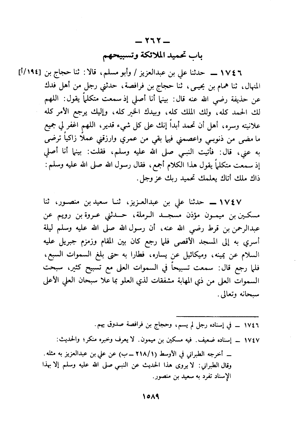 1747- حَدَّثَنَا عَلِيُّ بْنُ عَبْدِ الْعَزِيزِ، حَدَّثَنَا سَعِيدُ بْنُ مَنْصُورٍ، حَدَّثَنَا مِسْكِينُ بْنُ مَيْمُونٍ، مُؤَذِّنُ مَسْجِدِ الرَّمْلَةِ، حَدَّثَنِي عُرْوَةُ بْنُ رُوَيْمٍ عَنْ عَبْدِ الرَّحْمَنِ بْنِ قُرْطٍ، رَضِيَ اللَّهُ عَنْهُ, أَنَّ رَسُولَ اللهِ صَلى الله عَلَيه وَسَلم لَيْلَةَ أُسْرِيَ بِهِ إِلَى الْمَسْجِدِ الأَقْصَى, فَلَمَّا رَجَعَ كَانَ بَيْنَ الْمَقَامِ وَزَمْزَمَ، جِبْرِيلُ عَلَيْهِ السَّلاَمُ عَنْ يَمِينِهِ, وَمِيكَائِيلُ عَنْ يَسَارِهِ, فَطَارَا بِهِ, حَتَّى بَلَغَ السَّمَاوَاتِ السَّبْعَ, فَلَمَّا رَجَعَ قَالَ: سَمِعْتُ تَسْبِيحًا فِي السَّمَاوَاتِ الْعُلَى مَعَ تَسْبِيحٍ كَثِيرٍ سَبَّحَتِ السَّمَاوَاتُ الْعُلَى مِنْ ذِي الْمَهَابَةِ مُشْفِقَاتٍ لِذِي الْعُلُوِّ بِمَا عَلاَ، سُبْحَانَ الْعَلِيِّ الأَعْلَى سُبْحَانَهُ وَتَعَالَى.