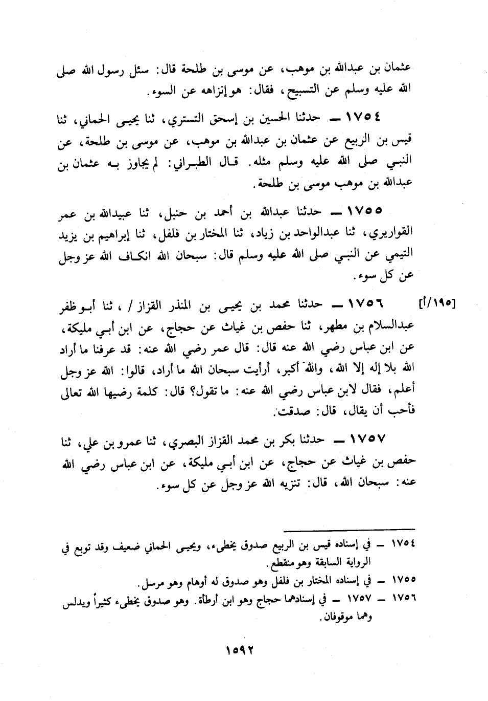1757- حَدَّثَنَا بَكْرُ بْنُ مُحَمَّدٍ الْقَزَّازُ الْبَصْرِيُّ، حَدَّثَنَا عَمْرُو بْنُ عَلِيُّ، حَدَّثَنَا حَفْصُ بْنُ غِيَاثٍ، عَنْ حَجَّاجٍ، عَنِ ابْنِ أَبِي مُلَيْكَةَ، عَنِ ابْنِ عَبَّاسٍ، رَضِيَ اللَّهُ عَنْهُ سُبْحَانَ اللهِ قَالَ: تَنْزِيهُ اللهِ عَزَّ وَجَلَّ عَنْ كُلِّ سُوءٍ.