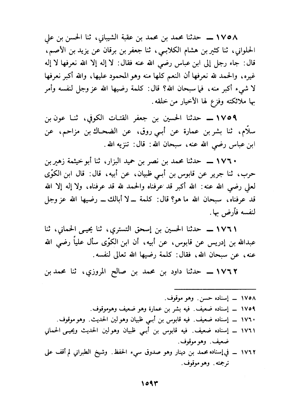 1758- حَدَّثَنَا مُحَمَّدُ بْنُ مُحَمَّدِ بْنِ عُقْبَةَ الشَّيْبَانِيُّ، حَدَّثَنَا الْحَسَنُ بْنُ عَلِيٍّ الْحُلْوَانِيُّ، حَدَّثَنَا كَثِيرُ بْنُ هِشَامٍ الْكِلاَبِيُّ، حَدَّثَنَا جَعْفَرُ بْنُ بُرْقَانَ، عَنْ يَزِيدَ بْنِ الأَصَمِّ، قَالَ: جَاءَ رَجُلٌ إِلَى ابْنِ عَبَّاسٍ رَضِيَ اللَّهُ عَنْهُ فَقَالَ: لاَ إِلَهَ إِلاَّ اللَّهُ نَعْرِفُهَا لاَ إِلَهَ غَيْرُهُ، وَالْحَمْدُ لِلَّهِ نَعْرِفُهَا أَنَّ النِّعَمَ كُلَّهَا مِنْهُ وَهُوَ الْمَحْمُودُ عَلَيْهَا، وَاللَّهُ أَكْبَرُ نَعْرِفُهَا لاَ شَيْءَ أَكْبَرُ مِنْهُ، فَمَا سُبْحَانَ اللهِ؟ قَالَ: كَلِمَةٌ رَضِيَهَا اللَّهُ عَزَّ وَجَلَّ لِنَفْسِهِ وَأَمَرَ بِهَا مَلاَئِكَتَهُ وَفَزِعَ لَهَا الأَخْيَارُ مِنْ خَلْقِهِ.