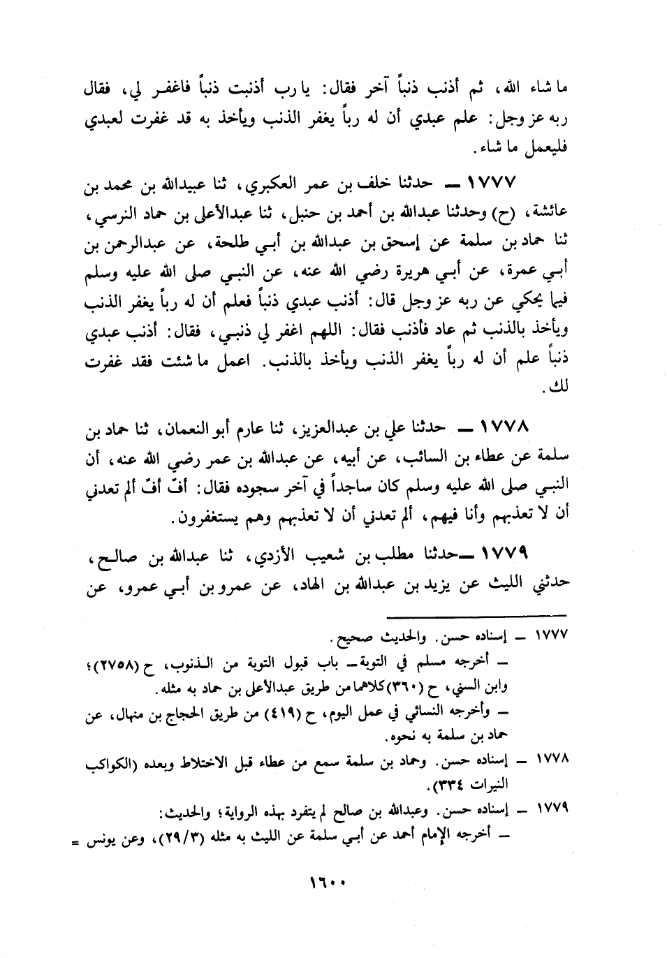 1777- حَدَّثَنَا خَلَفُ بْنُ عُمَرَ الْعُكْبَرِيُّ، حَدَّثَنَا عُبَيْدُ اللهِ بْنُ مُحَمَّدِ بْنِ عَائِشَةَ (ح) وَحَدَّثَنَا عَبْدُ اللهِ بْنُ أَحْمَدَ بْنِ حَنْبَلٍ، حَدَّثَنَا عَبْدُ الأَعْلَى بْنُ حَمَّادٍ النَّرْسِيُّ، حَدَّثَنَا حَمَّادُ بْنُ سَلَمَةَ، عَنْ إِسْحَاقَ بْنِ عَبْدِ اللهِ بْنِ أَبِي طَلْحَةَ، عَنْ عَبْدِ الرَّحْمَنِ بْنِ أَبِي عَمْرَةَ، عَنْ أَبِي هُرَيْرَةَ، رَضِيَ اللَّهُ عَنْهُ, عَنِ النَّبِيِّ صَلى الله عَلَيه وَسَلم فِيمَا يَحْكِي عَنْ رَبِّهِ عَزَّ وَجَلَّ, قَالَ: أَذْنَبَ عَبْدِي ذَنْبًا فَعَلِمَ أَنَّ لَهُ رَبًّا يَغْفِرُ الذَّنْبَ, وَيَأْخُذُ بِالذَّنْبِ، ثُمَّ عَادَ فَأَذْنَبَ, فَقَالَ: اللَّهُمَّ اغْفِرْ لِي ذَنْبِي، فَقَالَ: أَذْنَبَ عَبْدِي ذَنْبًا, عَلِمَ أَنَّ لَهُ رَبًّا يَغْفِرُ الذَّنْبَ, وَيَأْخُذُ بِالذَّنْبِ، اعْمَلْ مَا شِئْتَ فَقَدْ غَفَرْتُ لَكَ.