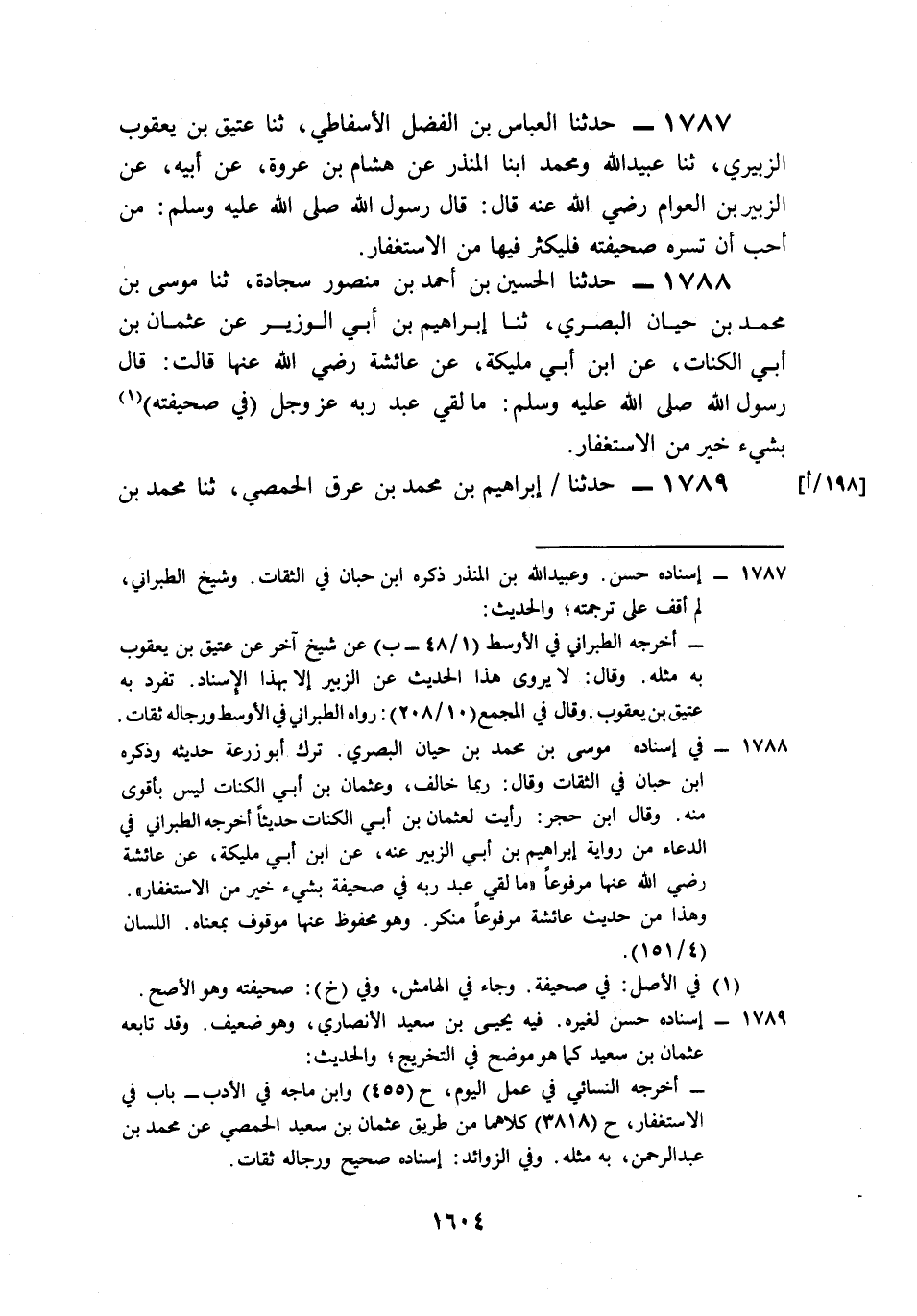 1788- حَدَّثَنَا الْحُسَيْنُ بْنُ أَحْمَدَ بْنِ مَنْصُورٍ سَجَّادَةُ، حَدَّثَنَا مُوسَى بْنُ مُحَمَّدِ بْنِ حَيَّانَ الْبَصْرِيُّ، حَدَّثَنَا إِبْرَاهِيمُ بْنُ أَبِي الْوَزِيرِ، عَنْ عُثْمَانَ بْنِ أَبِي الْكَنَّاتِ، عَنِ ابْنِ أَبِي مُلَيْكَةَ، عَنْ عَائِشَةَ، رَضِيَ اللَّهُ عَنْهَا قَالَتْ: قَالَ رَسُولُ اللهِ صَلى الله عَلَيه وَسَلم: مَا لَقِيَ عَبْدٌ رَبَّهُ عَزَّ وَجَلَّ فِي صَحِيفَتِهِ بِشَيْءٍ خَيْرٍ مِنَ الِاسْتِغْفَارِ.