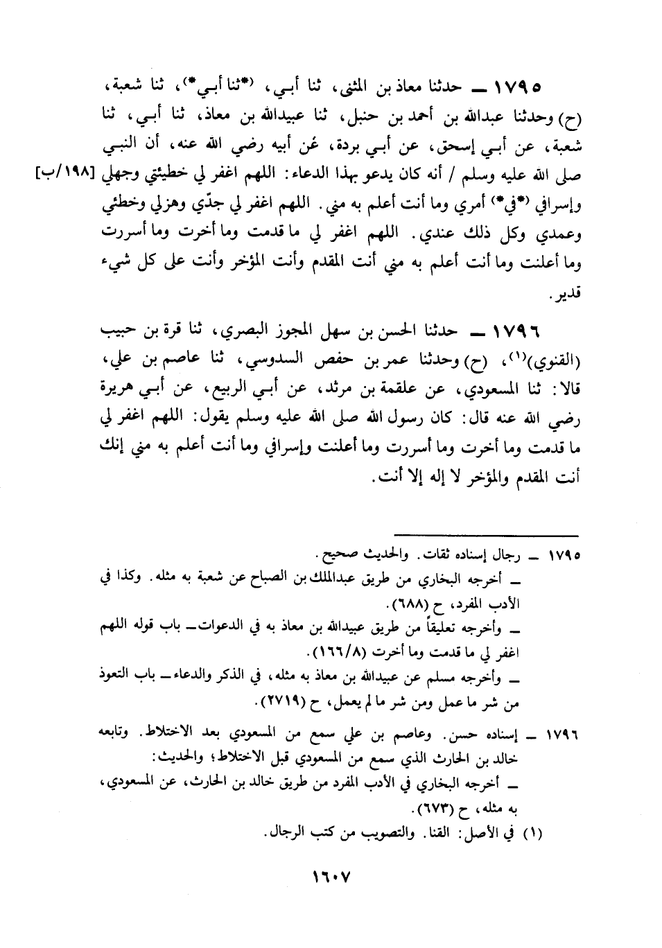 1795- حَدَّثَنَا مُعَاذُ بْنُ الْمُثَنَّى، حَدَّثَنَا أَبِي، حَدَّثَنَا أَبِي، حَدَّثَنَا شُعْبَةُ (ح) وَحَدَّثَنَا عَبْدُ اللهِ بْنُ أَحْمَدَ بْنِ حَنْبَلٍ، حَدَّثَنَا عُبَيْدُ اللهِ بْنُ مُعَاذٍ، حَدَّثَنَا أَبِي، حَدَّثَنَا شُعْبَةُ، عَنْ أَبِي إِسْحَاقَ، عَنْ أَبِي بُرْدَةَ، عَنْ أَبِيهِ، رَضِيَ اللَّهُ عَنْهُ, أَنَّ النَّبِيَّ صَلى الله عَلَيه وَسَلم أَنَّهُ كَانَ يَدْعُو بِهَذَا الدُّعَاءِ: اللَّهُمَّ اغْفِرْ لِي خَطِيئَتِي وَجَهْلِي، وَإِسْرَافِي فِي أَمْرِي، وَمَا أَنْتَ أَعْلَمُ بِهِ مِنِّي، اللَّهُمَّ اغْفِرْ لِي جَدِّي وَهَزْلِي، وَخَطَئِي وَعَمْدِي، وَكُلُّ ذَلِكَ عِنْدِي، اللَّهُمَّ اغْفِرْ لِي مَا قَدَّمْتُ وَمَا أَخَّرْتُ، وَمَا أَسْرَرْتُ وَمَا أَعْلَنْتُ، وَمَا أَنْتَ أَعْلَمُ بِهِ مِنِّي، أَنْتَ الْمُقَدِّمُ وَأَنْتَ الْمُؤَخِّرُ, وَأَنْتَ عَلَى كُلِّ شَيْءٍ قَدِيرٌ.