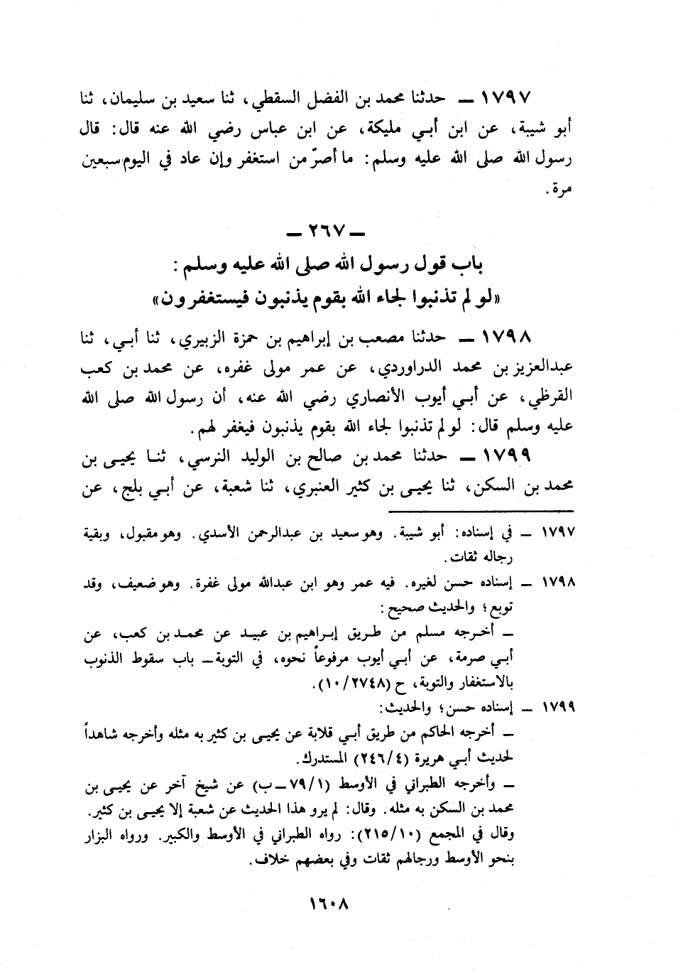 1797- حَدَّثَنَا مُحَمَّدُ بْنُ الْفَضْلِ السَّقَطِيُّ، حَدَّثَنَا سَعِيدُ بْنُ سُلَيْمَانَ، حَدَّثَنَا أَبُو شَيْبَةَ، عَنِ ابْنِ أَبِي مُلَيْكَةَ، عَنِ ابْنِ عَبَّاسٍ، رَضِيَ اللَّهُ عَنْهُ قَالَ: قَالَ رَسُولُ اللهِ صَلى الله عَلَيه وَسَلم: مَا أَصَرَّ مَنِ اسْتَغْفَرَ وَإِنْ عَادَ فِي الْيَوْمِ سَبْعِينَ مَرَّةً.