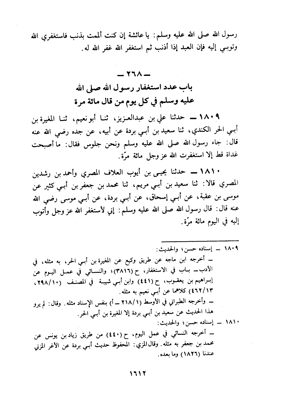 268- بَابُ عَدَدِ اسْتِغْفَارِ رَسُولِ اللهِ صَلى الله عَلَيه وَسَلم فِي كُلِّ يَوْمٍ مَنْ قَالَ مِئَةَ مَرَّةٍ.