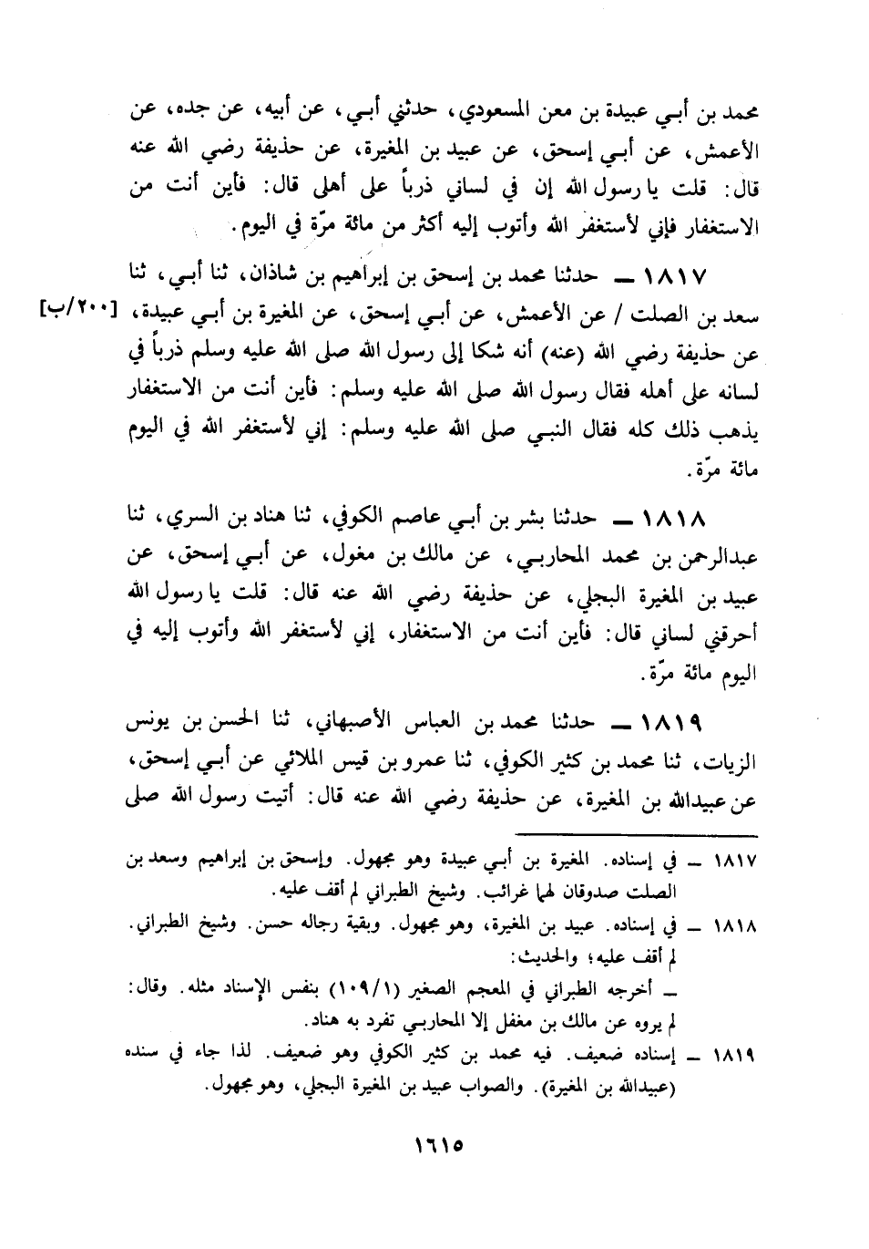 1818- حَدَّثَنَا بِشْرُ بْنُ أَبِي عَاصِمٍ الْكُوفِيُّ، حَدَّثَنَا هَنَّادُ بْنُ السَّرِيِّ، حَدَّثَنَا عَبْدُ الرَّحْمَنِ بْنُ مُحَمَّدٍ الْمُحَارِبِيُّ، عَنْ مَالِكِ بْنِ مِغْوَلٍ، عَنْ أَبِي إِسْحَاقَ، عَنْ عُبَيْدِ بْنِ الْمُغِيرَةِ الْبَجَلِيِّ، عَنْ حُذَيْفَةَ، رَضِيَ اللَّهُ عَنْهُ قَالَ: قُلْتُ: يَا رَسُولَ اللهِ, أَحْرَقَنِي لِسَانِي، قَالَ: فَأَيْنَ أَنْتَ مِنَ الِاسْتِغْفَارِ؟ إِنِّي لَأَسْتَغْفِرُ اللَّهَ وَأَتُوبُ إِلَيْهِ فِي الْيَوْمِ مِئَةَ مَرَّةٍ.