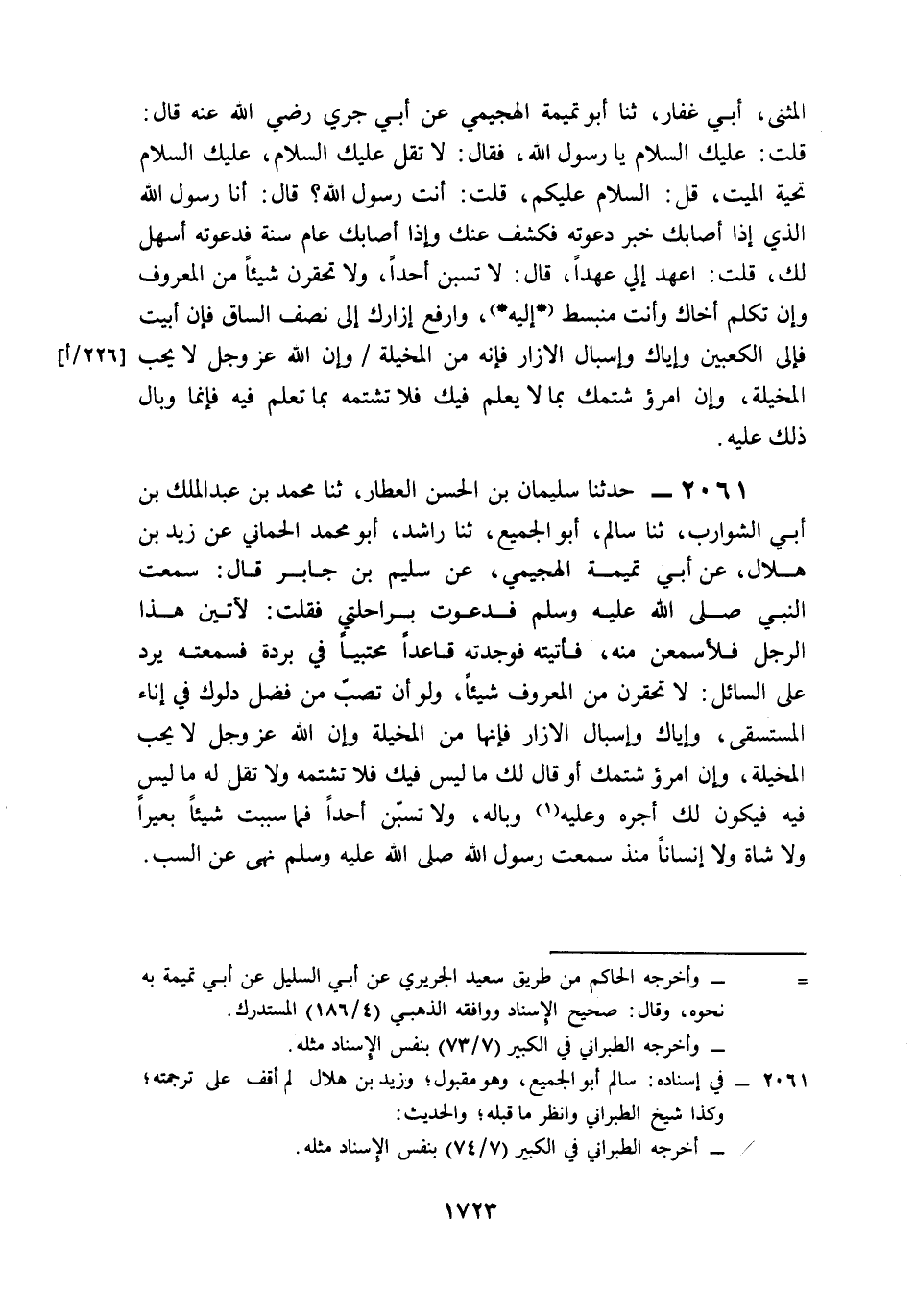 2061- حَدَّثَنَا سُلَيْمَانُ بْنُ الْحَسَنِ الْعَطَّارُ، حَدَّثَنَا مُحَمَّدُ بْنُ عَبْدِ الْمَلِكِ بْنِ أَبِي الشَّوَارِبِ، حَدَّثَنَا سَالِمٌ, أَبُو الْجَمِيعِ، حَدَّثَنَا رَاشِدٌ, أَبُو مُحَمَّدٍ الْحِمَّانِيُّ، عَنْ زَيْدِ بْنِ هِلاَلٍ، عَنْ أَبِي تَمِيمَةَ الْهُجَيْمِيِّ، عَنْ سُلَيْمِ بْنِ جَابِرٍ، قَالَ: سَمِعْتُ النَّبِيَّ صَلى الله عَلَيه وَسَلم, فَدَعَوْتُ بِرَاحِلَتِي, فَقُلْتُ: لَآتِيَنَّ هَذَا الرَّجُلَ, فَلَأَسْمَعَنَّ مِنْهُ، فَأَتَيْتُهُ, فَوَجَدْتُهُ قَاعِدًا مُحْتَبِيًا فِي بُرْدَةٍ, فَسَمِعْتُهُ يَرُدُّ عَلَى السَّائِلِ: لاَ تَحْقِرَنَّ مِنَ الْمَعْرُوفِ شَيْئًا، وَلَوْ أَنْ تَصُبَّ مِنْ فَضْلِ دَلْوِكَ فِي إِنَاءِ الْمُسْتَسْقِي، وَإِيَّاكَ وَإِسْبَالَ الإِزَارِ, فَإِنَّهَا مِنَ الْمَخِيلَةِ, وَإِنَّ اللَّهَ عَزَّ وَجَلَّ لاَ يُحِبُّ الْمَخِيلَةَ، وَإِنِ امْرُؤٌ شَتَمَكَ, أَوْ قَالَ لَكَ مَا لَيْسَ فِيكَ فَلاَ تَشْتُمْهُ وَلاَ تَقُلْ لَهُ مَا لَيْسَ فِيهِ ؛ فَيَكُونُ لَكَ أَجْرُهُ وَعَلَيْهِ وَبَالُهُ، وَلاَ تَسُبَّنَّ أَحَدًا, فَمَا سَبَبْتُ شَيْئًا بَعِيرًا وَلاَ شَاةً وَلاَ إِنْسَانًا مُنْذُ سَمِعْتُ رَسُولَ اللهِ صَلى الله عَلَيه وَسَلم نَهَى عَنِ السَّبِّ.