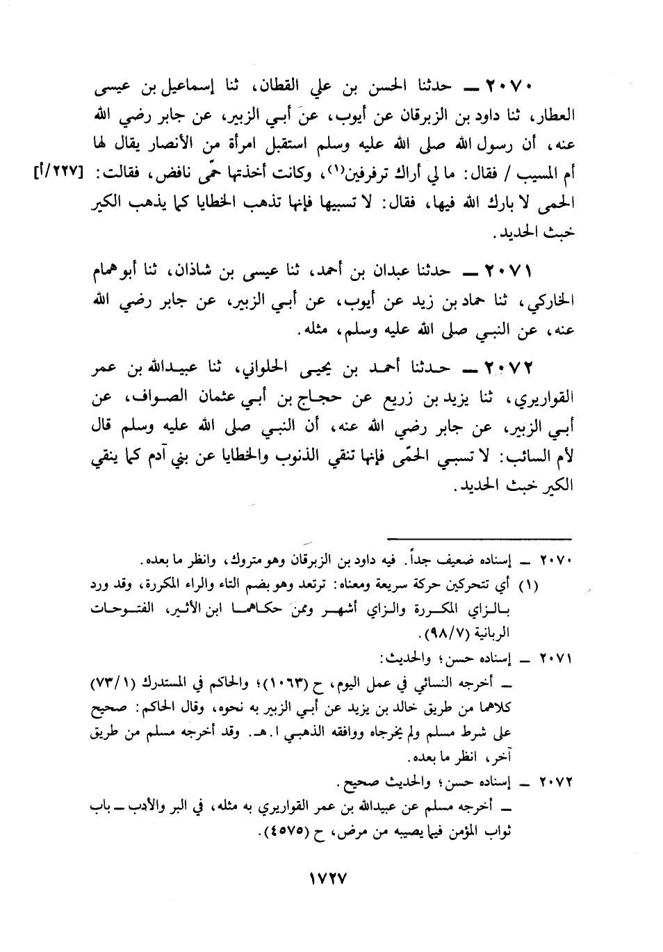 2070- حَدَّثَنَا الْحَسَنُ بْنُ عَلِيٍّ الْقَطَّانُ، حَدَّثَنَا إِسْمَاعِيلُ بْنُ عِيسَى الْعَطَّارُ، حَدَّثَنَا دَاوُدُ بْنُ الزِّبْرِقَانِ، عَنْ أَيُّوبَ، عَنْ أَبِي الزُّبَيْرِ، عَنْ جَابِرٍ، رَضِيَ اللَّهُ عَنْهُ, أَنَّ رَسُولَ اللهِ صَلى الله عَلَيه وَسَلم اسْتَقْبَلَ امْرَأَةً مِنَ الأَنْصَارِ, يُقَالُ لَهَا: أُمُّ الْمُسَيَّبِ, فَقَالَ: مَالِي أَرَاكِ تُرَفْرِفِينَ؟ وَكَانَتْ أَخَذَتْهَا حُمَّى نَافِضٌ, فَقَالَتِ: الْحُمَّى لاَ بَارِكَ اللَّهُ فِيهَا، فَقَالَ: لاَ تَسُبِّيهَا, فَإِنَّهَا تُذْهِبُ الْخَطَايَا كَمَا يُذْهِبُ الْكِيرُ خَبَثَ الْحَدِيدِ.