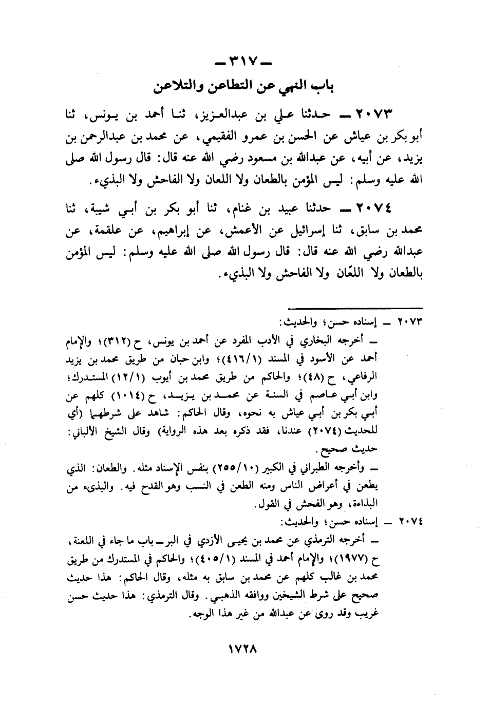 2073- حَدَّثَنَا عَلِيُّ بْنُ عَبْدِ الْعَزِيزِ، حَدَّثَنَا أَحْمَدُ بْنُ يُونُسَ، حَدَّثَنَا أَبُو بَكْرِ بْنُ عَيَّاشٍ، عَنِ الْحَسَنِ بْنِ عَمْرٍو الْفُقَيْمِيِّ، عَنْ مُحَمَّدِ بْنِ عَبْدِ الرَّحْمَنِ بْنِ يَزِيدَ، عَنْ أَبِيهِ، عَنْ عَبْدِ اللهِ بْنِ مَسْعُودٍ، رَضِيَ اللَّهُ عَنْهُ قَالَ: قَالَ رَسُولُ اللهِ صَلى الله عَلَيه وَسَلم: لَيْسَ الْمُؤْمِنُ بِالطَّعَّانِ وَلاَ اللِّعَانِ وَلاَ الْفَاحِشِ وَلاَ الْبَذِيءِ.
