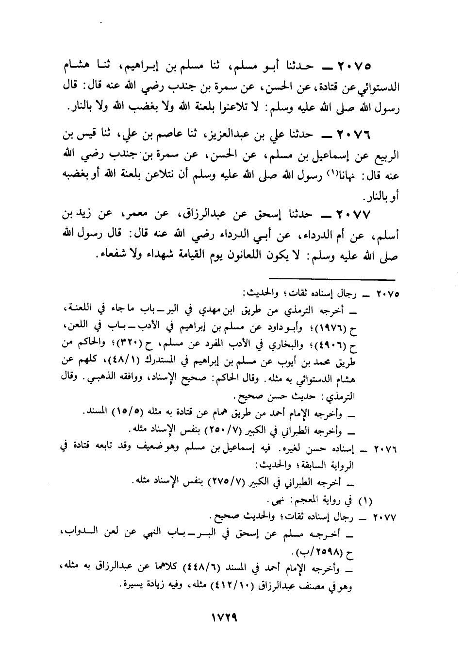 2077- حَدَّثَنَا إِسْحَاقُ، عَنْ عَبْدِ الرَّزَّاقِ، عَنْ مَعْمَرٍ، عَنْ زَيْدِ بْنِ أَسْلَمَ، عَنْ أُمِّ الدَّرْدَاءِ، عَنْ أَبِي الدَّرْدَاءِ، رَضِيَ اللَّهُ عَنْهُ قَالَ: قَالَ رَسُولُ اللهِ صَلى الله عَلَيه وَسَلم: لاَ يَكُونُ اللَّعَّانُونَ يَوْمَ الْقِيَامَةِ شُهَدَاءَ وَلاَ شُفَعَاءَ.