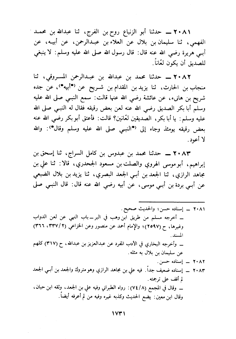 2081- حَدَّثَنَا أَبُو الزِّنْبَاعِ رَوْحُ بْنُ الْفَرَجِ، حَدَّثَنَا عَبْدُ اللهِ بْنُ مُحَمَّدٍ الْفَهْمِيُّ، حَدَّثَنَا سُلَيْمَانُ بْنُ بِلاَلٍ، عَنِ الْعَلاَءِ بْنِ عَبْدِ الرَّحْمَنِ، عَنْ أَبِيهِ، عَنْ أَبِي هُرَيْرَةَ، رَضِيَ اللَّهُ عَنْهُ قَالَ: قَالَ رَسُولُ اللهِ صَلى الله عَلَيه وَسَلم: لاَ يَنْبَغِي لِلصَّدِيقِ أَنْ يَكُونَ لَعَّانًا.
