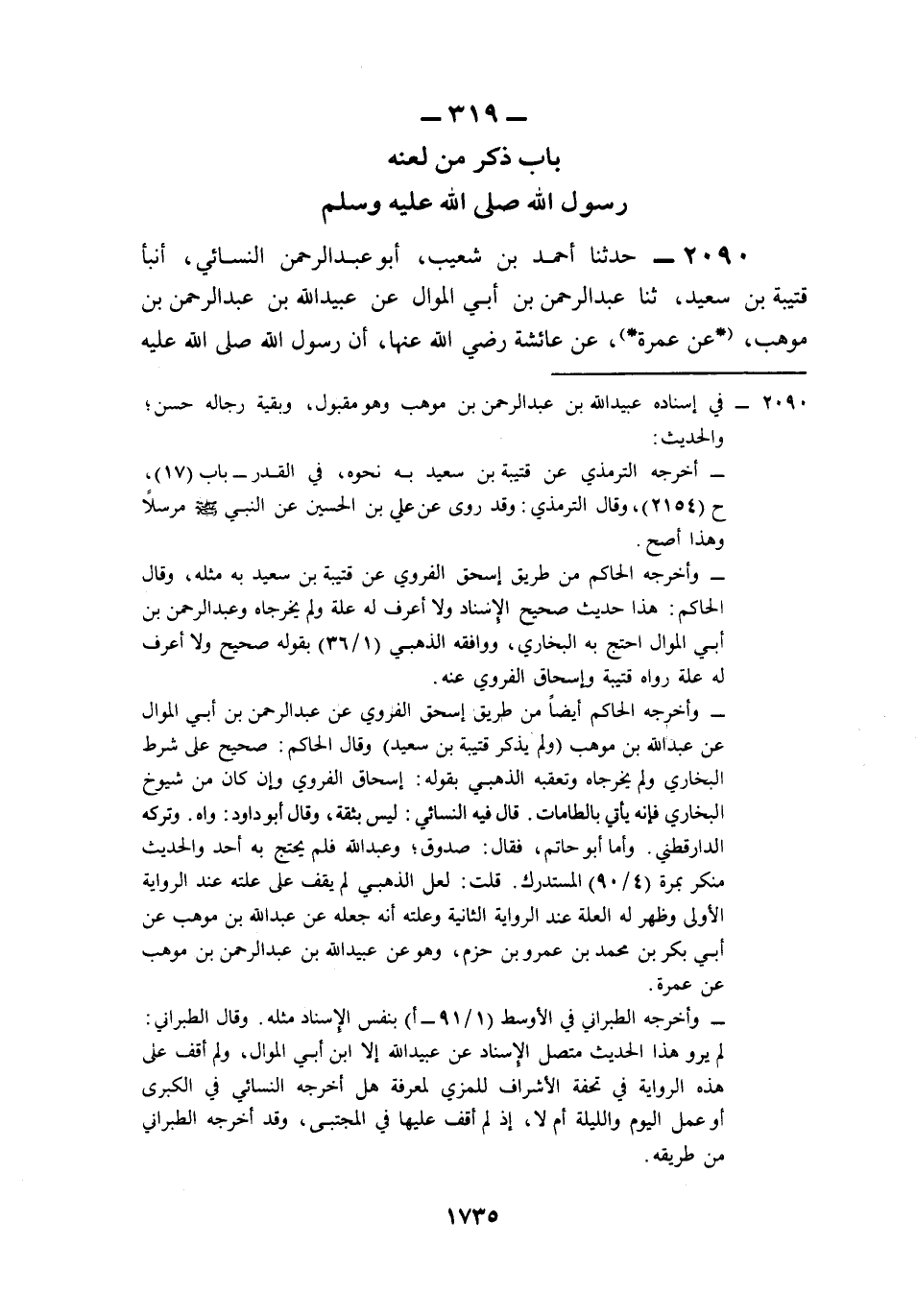 2090- حَدَّثَنَا أَحْمَدُ بْنُ شُعَيْبٍ, أَبُو عَبْدِ الرَّحْمَنِ النَّسَائِيُّ، أَخْبَرَنَا قُتَيْبَةُ بْنُ سَعِيدٍ، حَدَّثَنَا عَبْدُ الرَّحْمَنِ بْنُ أَبِي الْمَوَالِ، عَنْ عُبَيْدِ اللهِ بْنِ عَبْدِ الرَّحْمَنِ بْنِ مَوْهَبٍ، عَنْ عَمْرَةَ، عَنْ عَائِشَةَ، رَضِيَ اللَّهُ عَنْهَا, أَنَّ رَسُولَ اللهِ صَلى الله عَلَيه وَسَلم قَالَ: سِتَّةٌ لَعَنْتُهُمْ, وَكُلُّ نَبِيٍّ مُجَابٍ: الزَّائِدُ فِي كِتَابِ اللهِ عَزَّ وَجَلَّ، وَالْمُكَذِّبُ بِقَدَرِ اللهِ، وَالْمُتَسَلِّطُ بِالْجَبَرُوتِ, لِيُعِزَّ بِذَلِكَ مَنْ أَذَلَّ اللَّهُ, وَيُذِلَّ مَنْ أَعَزَّ اللَّهُ، وَالْمُسْتَحِلُّ مَحَارِمَ اللهِ، وَالْمُسْتَحِلُّ مِنْ عِتْرَتِي مَا حَرَّمَ اللَّهُ، وَالتَّارِكُ السُّنَّةَ.