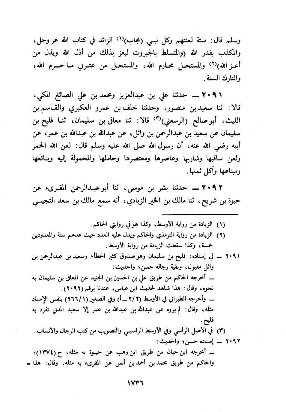 2091- حَدَّثَنَا عَلِيُّ بْنُ عَبْدِ الْعَزِيزِ، وَمُحَمَّدُ بْنُ عَلِيٍّ الصَّائِغُ الْمَكِّيُّ، قَالاَ: حَدَّثَنَا سَعِيدُ بْنُ مَنْصُورٍ، وَحَدَّثَنَا خَلَفُ بْنُ عَمْرٍو الْعُكْبَرِيُّ، وَالْقَاسِمُ بْنُ اللَّيْثِ, أَبُو صَالِحٍ الرَّسْعَنِيُّ، قَالاَ: حَدَّثَنَا مُعَافَى بْنُ سُلَيْمَانَ، حَدَّثَنَا فُلَيْحُ بْنُ سُلَيْمَانَ، عَنْ سَعِيدِ بْنِ عَبْدِ الرَّحْمَنِ بْنِ وَائِلٍ، عَنْ عَبْدِ اللهِ بْنِ عَبْدِ اللهِ بْنِ عُمَرَ، عَنْ أَبِيهِ، رَضِيَ اللَّهُ عَنْهُ, أَنَّ رَسُولَ اللهِ صَلى الله عَلَيه وَسَلم قَالَ: لَعَنَ اللَّهُ الْخَمْرَ، وَلَعَنَ سَاقِيَهَا، وَشَارِبَهَا، وَعَاصِرَهَا، وَمُعْتَصِرَهَا، وَحَامِلَهَا، وَالْمَحْمُولَةَ إِلَيْهِ، وَبَائِعَهَا، وَمُبْتَاعَهَا، وَآكِلَ ثَمَنِهَا.