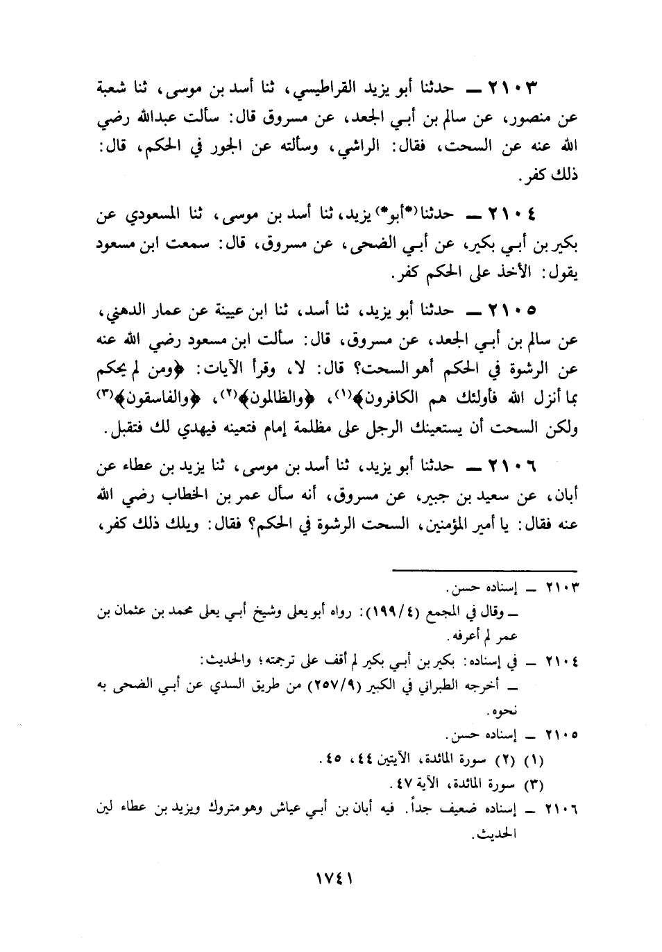 2104- حَدَّثَنَا أَبُو يَزِيدَ، حَدَّثَنَا أَسَدُ بْنُ مُوسَى، حَدَّثَنَا الْمَسْعُودِيُّ، عَنْ بُكَيْرِ بْنِ أَبِي بُكَيْرٍ، عَنْ أَبِي الضُّحَى، عَنْ مَسْرُوقٍ، قَالَ: سَمِعْتُ ابْنَ مَسْعُودٍ، يَقُولُ: الأَخْذُ عَلَى الْحُكْمِ كُفْرٌ.