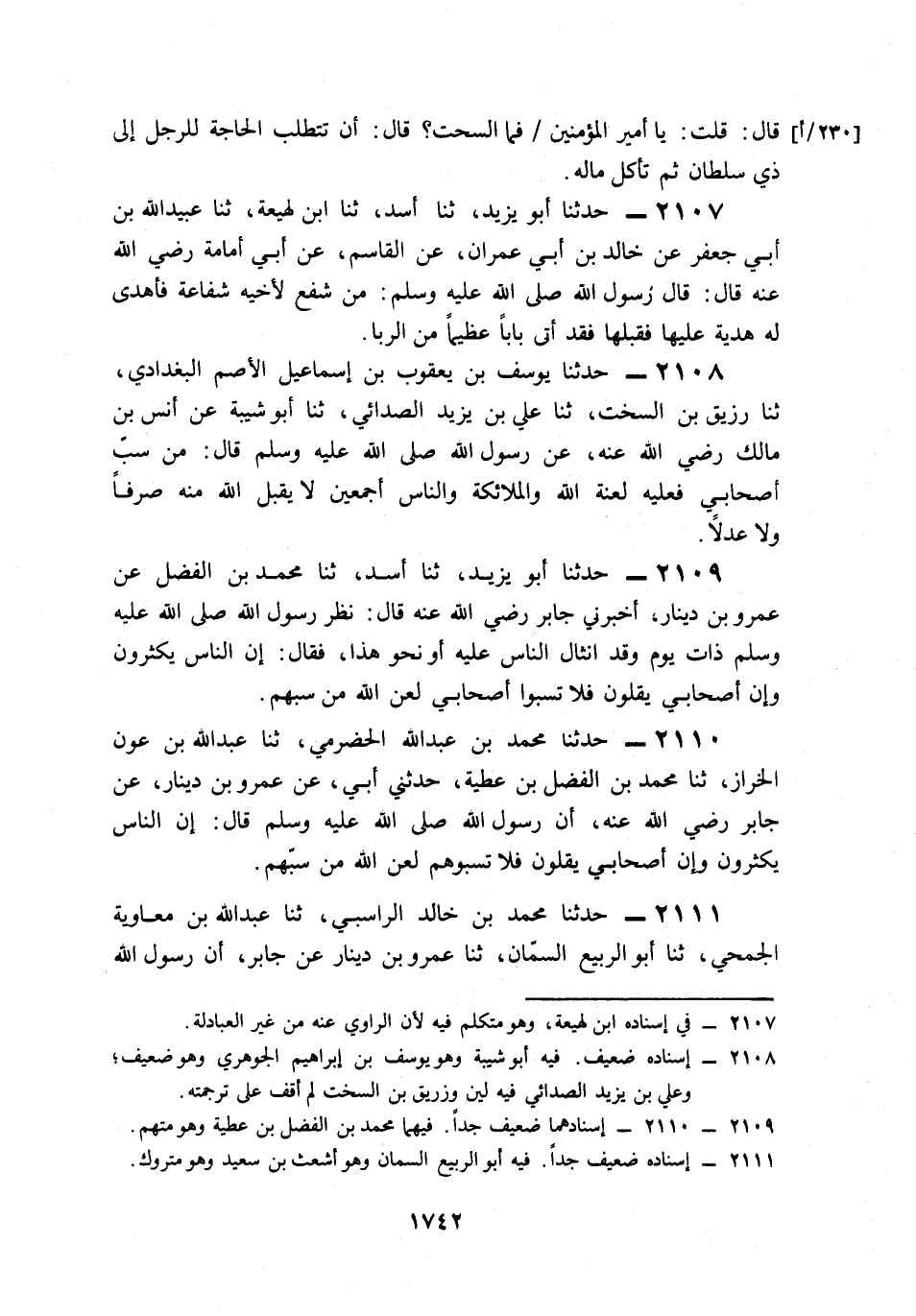 2108- حَدَّثَنَا يُوسُفُ بْنُ يَعْقُوبَ بْنِ إِسْمَاعِيلَ الأَصَمُّ الْبَغْدَادِيُّ، حَدَّثَنَا رُزَيْقُ بْنُ السَّخْتِ، حَدَّثَنَا عَلِيُّ بْنُ يَزِيدَ الصُّدَائِيُّ، حَدَّثَنَا أَبُو شَيْبَةَ، عَنْ أَنَسِ بْنِ مَالِكٍ، رَضِيَ اللَّهُ عَنْهُ, عَنْ رَسُولِ اللهِ صَلى الله عَلَيه وَسَلم قَالَ: مَنْ سَبَّ أَصْحَابِي فَعَلَيْهِ لَعْنَةُ اللهِ وَالْمَلاَئِكَةِ وَالنَّاسِ أَجْمَعِينَ، لاَ يَقْبَلُ اللَّهُ مِنْهُ صَرْفًا وَلاَ عَدْلاً.