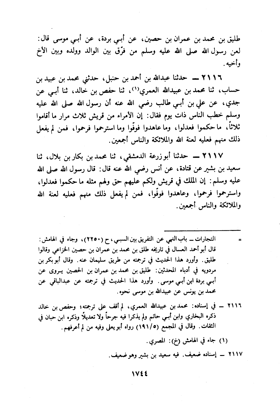 2116- حَدَّثَنَا عَبْدُ اللهِ بْنُ أَحْمَدَ بْنِ حَنْبَلٍ، حَدَّثَنِي مُحَمَّدُ بْنُ عُبَيْدِ بْنِ حِسَابٍ، حَدَّثَنَا مُحَمَّدُ بْنُ عُبَيْدِ اللهِ الْعُمَرِيُّ، حَدَّثَنَا حَفْصُ بْنُ خَالِدٍ، حَدَّثَنَا أَبِي، عَنْ جَدِّي، عَنْ عَلِيِ بْنِ أَبِي طَالِبٍ، رَضِيَ اللَّهُ عَنْهُ, أَنَّ رَسُولَ اللهِ صَلى الله عَلَيه وَسَلم خَطَبَ النَّاسَ ذَاتَ يَوْمٍ فَقَالَ: إِنَّ الأُمَرَاءَ مِنْ قُرَيْشٍ, ثَلاَثَ مِرَارٍ, مَا أَقَامُوا ثَلاَثًا: مَا حَكَمُوا فَعَدَلُوا، وَمَا عَاهَدُوا فَوَفَوْا، وَمَا اسْتُرْحِمُوا فَرَحِمُوا, فَمَنْ لَمْ يَفْعَلْ ذَلِكَ مِنْهُمْ فَعَلَيْهِ لَعْنَةُ اللهِ وَالْمَلاَئِكَةِ وَالنَّاسِ أَجْمَعِينَ.