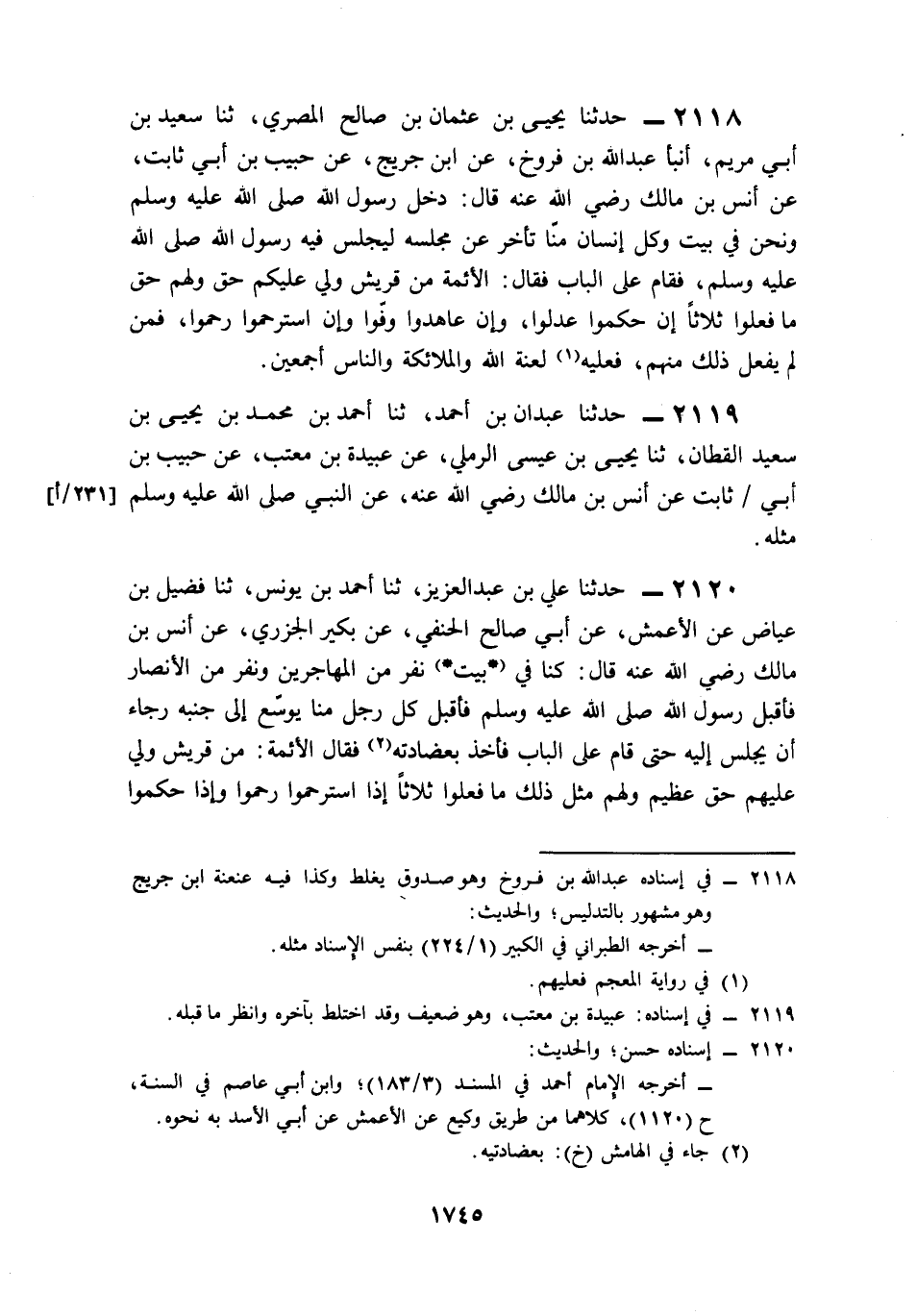 2118- حَدَّثَنَا يَحْيَى بْنُ عُثْمَانَ بْنِ صَالِحٍ الْمِصْرِيُّ، حَدَّثَنَا سَعِيدُ بْنُ أَبِي مَرْيَمَ، أَخْبَرَنَا عَبْدُ اللهِ بْنُ فَرُّوخَ، عَنِ ابْنِ جُرَيْجٍ، عَنْ حَبِيبِ بْنِ أَبِي ثَابِتٍ، عَنْ أَنَسِ بْنِ مَالِكٍ، رَضِيَ اللَّهُ عَنْهُ قَالَ: دَخَلَ رَسُولُ اللهِ صَلى الله عَلَيه وَسَلم وَنَحْنُ فِي بَيْتٍ, وَكُلُّ إِنْسَانٍ مِنَّا تَأَخَّرَ عَنْ مَجْلِسِهِ لِيَجْلِسَ فِيهِ رَسُولُ اللهِ صَلى الله عَلَيه وَسَلم, فَقَامَ عَلَى الْبَابِ, فَقَالَ: الأَئِمَّةُ مِنْ قُرَيْشٍ، وَلِي عَلَيْكُمْ حَقٌّ، وَلَهُمْ حَقٌّ مَا فَعَلُوا, ثَلاَثًا: إِنْ حَكَمُوا عَدَلُوا، وَإِنْ عَاهَدُوا وَفَوْا، وَإِنِ اسْتُرْحِمُوا رَحِمُوا، فَمَنْ لَمْ يَفْعَلْ ذَلِكَ مِنْهُمْ فَعَلَيْهِ لَعْنَةُ اللهِ وَالْمَلاَئِكَةِ وَالنَّاسِ أَجْمَعِينَ.