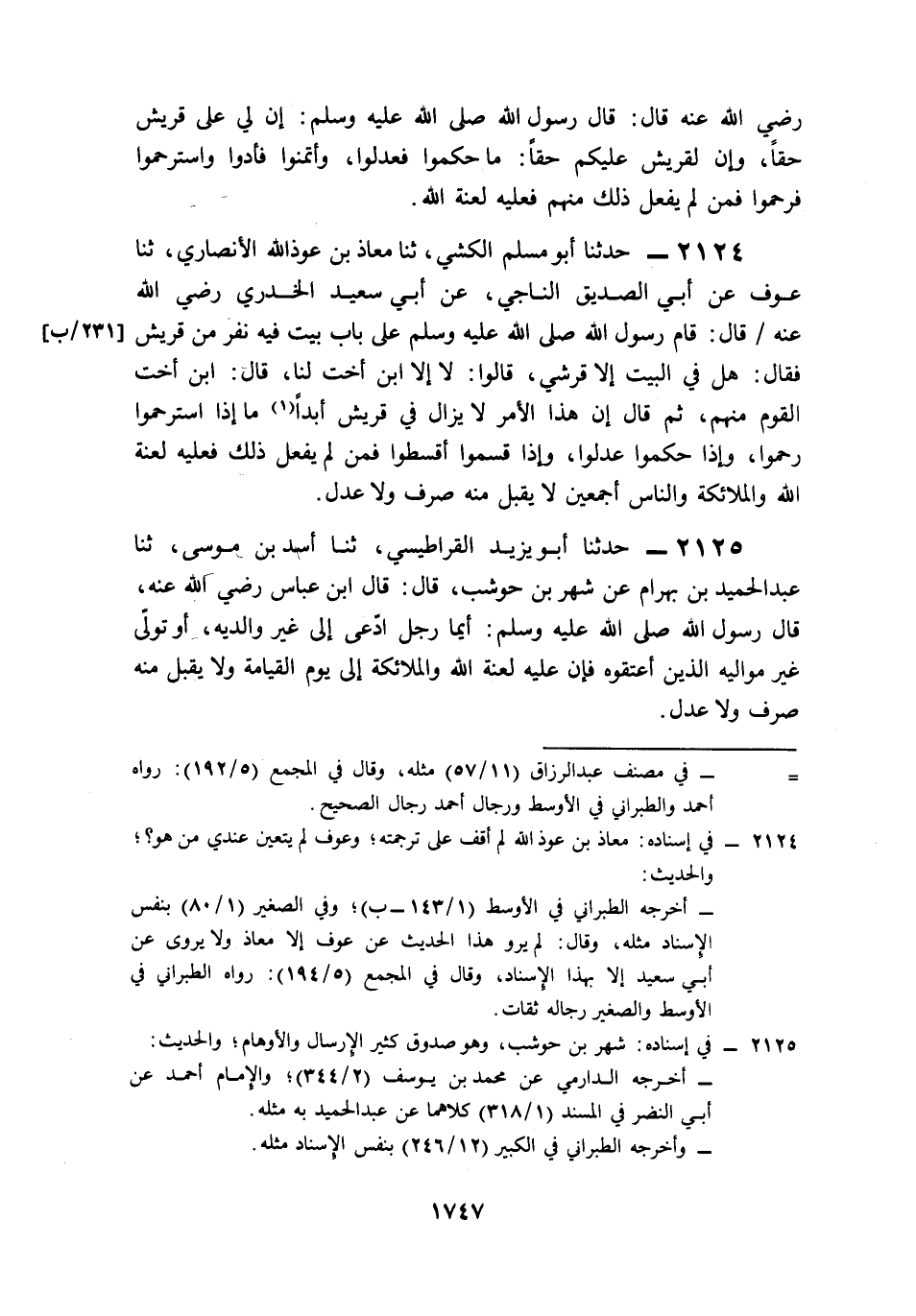 2124- حَدَّثَنَا أَبُو مُسْلِمٍ الْكَشِّيُّ، حَدَّثَنَا مُعَاذُ بْنُ عَوْذِ اللهِ الأَنْصَارِيُّ، حَدَّثَنَا عَوْفٌ، عَنْ أَبِي الصِّدِّيقِ النَّاجِيِّ، عَنْ أَبِي سَعِيدٍ الْخُدْرِيِّ، رَضِيَ اللَّهُ عَنْهُ قَالَ: قَامَ رَسُولُ اللهِ صَلى الله عَلَيه وَسَلم عَلَى بَابِ بَيْتٍ فِيهِ نَفَرٌ مِنْ قُرَيْشٍ, فَقَالَ: هَلْ فِي الْبَيْتِ إِلاَّ قُرَشِيٌّ؟ قَالُوا: لاَ, إِلاَّ ابْنَ أُخْتٍ لَنَا, قَالَ: ابْنُ أُخْتِ الْقَوْمِ مِنْهُمْ, ثُمَّ قَالَ: إِنَّ هَذَا الأَمْرَ لاَ يَزَالُ فِي قُرَيْشٍ أَبَدًا مَا إِذَا اسْتُرْحِمُوا رَحِمُوا، وَإِذَا حَكَمُوا عَدَلُوا، وَإِذَا قَسَمُوا أَقْسَطُوا، فَمَنْ لَمْ يَفْعَلْ ذَلِكَ فَعَلَيْهِ لَعْنَةُ اللهِ وَالْمَلاَئِكَةِ وَالنَّاسِ أَجْمَعِينَ, لاَ يُقْبَلُ مِنْهُ صَرْفٌ وَلاَ عَدْلٌ.