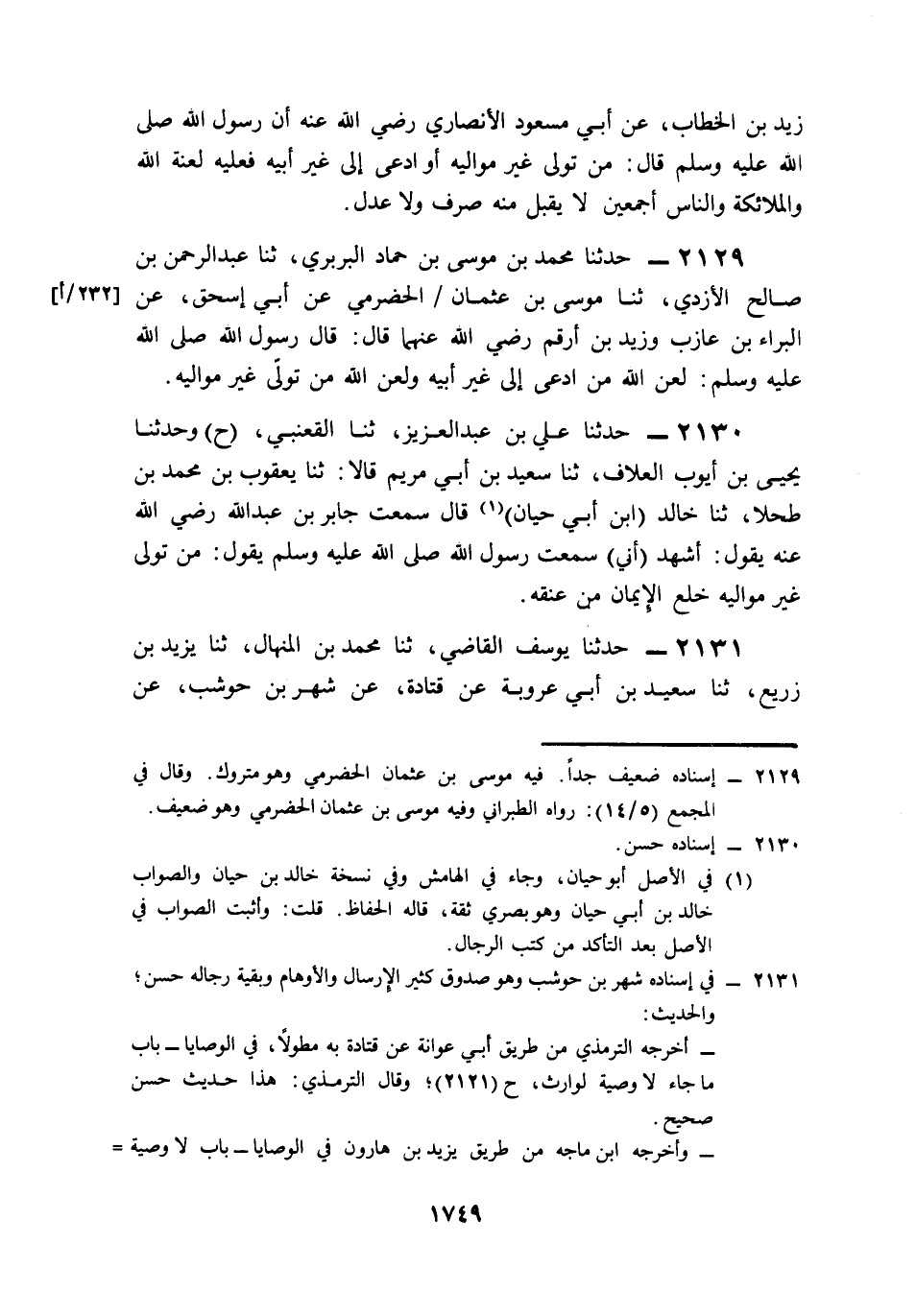 2131- حَدَّثَنَا يُوسُفُ الْقَاضِي، حَدَّثَنَا مُحَمَّدُ بْنُ الْمِنْهَالِ، حَدَّثَنَا يَزِيدُ بْنُ زُرَيْعٍ، حَدَّثَنَا سَعِيدُ بْنُ أَبِي عَرُوبَةَ، عَنْ قَتَادَةَ، عَنْ شَهْرِ بْنِ حَوْشَبٍ، عَنْ عَبْدِ الرَّحْمَنِ بْنِ غَنْمٍ، عَنْ عَمْرِو بْنِ خَارِجَةَ، رَضِيَ اللَّهُ عَنْهُ, عَنِ النَّبِيِّ صَلى الله عَلَيه وَسَلم قَالَ: مَنِ ادَّعَى إِلَى غَيْرِ أَبِيهِ، أَوْ تَوَلَّى غَيْرَ مَوَالِيهِ رَغْبَةً عَنْهُمْ, فَعَلَيْهِ لَعْنَةُ اللهِ وَالْمَلاَئِكَةِ وَالنَّاسِ أَجْمَعِينَ.