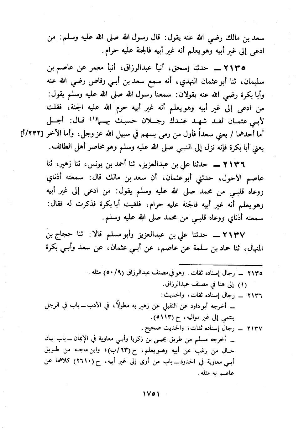 2135- حَدَّثَنَا إِسْحَاقُ، أَخْبَرَنَا عَبْدُ الرَّزَّاقِ، أَخْبَرَنَا مَعْمَرٌ، عَنْ عَاصِمِ بْنِ سُلَيْمَانَ، حَدَّثَنَا أَبُو عُثْمَانَ النَّهْدِيُّ، أَنَّهُ سَمِعَ سَعْدَ بْنَ أَبِي وَقَّاصٍ، رَضِيَ اللَّهُ عَنْهُ, وَأَبَا بَكْرَةَ رَضِيَ اللَّهُ عَنْهُ يَقُولاَنِ: سَمِعْنَا رَسُولَ اللهِ صَلى الله عَلَيه وَسَلم يَقُولُ: مَنِ ادَّعَى إِلَى غَيْرِ أَبِيهِ وَهُوَ يَعْلَمُ أَنَّهُ غَيْرُ أَبِيهِ, حَرَّمَ اللَّهُ عَلَيْهِ الْجَنَّةَ, فَقُلْتُ لِأَبِي عُثْمَانَ: لَقَدْ شَهِدَ عِنْدَكَ رَجُلاَنِ حَسْبُكَ بِهِمَا, قَالَ: أَجَلْ, أَمَّا أَحَدُهُمَا, يَعْنِي سَعْدًا, فَأَوَّلُ مَنْ رَمَى بِسَهْمٍ فِي سَبِيلِ اللهِ عَزَّ وَجَلَّ، وَأَمَّا الآخَرُ يَعْنِي أَبَا بَكْرَةَ, فَإِنَّهُ نَزَلَ إِلَى النَّبِيِّ صَلى الله عَلَيه وَسَلم وَهُوَ مُحَاصِرٌ أَهْلَ الطَّائِفِ.