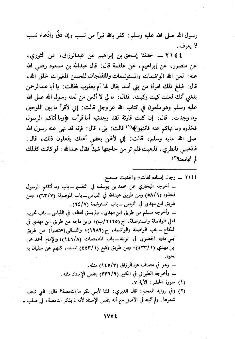 2144- حَدَّثَنَا إِسْحَاقُ بْنُ إِبْرَاهِيمَ، عَنْ عَبْدِ الرَّزَّاقِ، عَنِ الثَّوْرِيِّ، عَنْ مَنْصُورٍ، عَنْ إِبْرَاهِيمَ، عَنْ عَلْقَمَةَ قَالَ: قَالَ عَبْدُ اللهِ بْنُ مَسْعُودٍ رَضِيَ اللَّهُ عَنْهُ: لَعَنَ اللَّهُ الْوَاشِمَاتِ وَالْمُسْتَوْشِمَاتِ، وَالْمُتَفَلِّجَاتِ لِلْحُسْنِ, الْمُغَيِّرَاتِ خَلْقَ اللهِ، قَالَ: فَبَلَغَ ذَلِكَ امْرَأَةً مِنْ بَنِي أَسَدٍ, يُقَالُ لَهَا: أُمُّ يَعْقُوبَ, فَقَالَتْ: يَا أَبَا عَبْدِ الرَّحْمَنِ, بَلَغَنِي أَنَّكَ لَعَنْتَ كَيْتَ وَكَيْتَ، فَقَالَ: مَا لِي لاَ أَلْعَنُ مَنْ لَعَنَهُ رَسُولُ اللهِ صَلى الله عَلَيه وَسَلم, وَهُوَ مَلْعُونٌ فِي كِتَابِ اللهِ عَزَّ وَجَلَّ، قَالَتْ: إِنِّي لَأَقْرَأُ مَا بَيْنَ اللَّوْحَيْنِ, وَمَا وَجَدْتُ، قَالَ: إِنْ كُنْتِ قَارِئَةً لَقَدْ وَجَدْتِيهِ, أَمَا قَرَأْتِ: {وَمَا آتَاكُمُ الرَّسُولُ فَخُذُوهُ وَمَا نَهَاكُمْ عَنْهُ فَانْتَهُوا}؟ قَالَتْ: بَلَى، قَالَ: فَإِنَّهُ قَدْ نَهَى عَنْهُ رَسُولُ اللهِ صَلى الله عَلَيه وَسَلم قَالَتْ: إِنِّي لَأَظُنُّ بَعْضَ أَهْلِكَ يَفْعَلُونَ ذَلِكَ, قَالَ: فَاذْهَبِي, فَانْظُرِي, فَذَهَبَتْ, فَلَمْ تَرَ مِنْ حَاجَتِهَا شَيْئًا، فَقَالَ عَبْدُ اللهِ: لَوْ كَانَتْ كَذَلِكَ لَمْ تُجَامِعْنَا.
