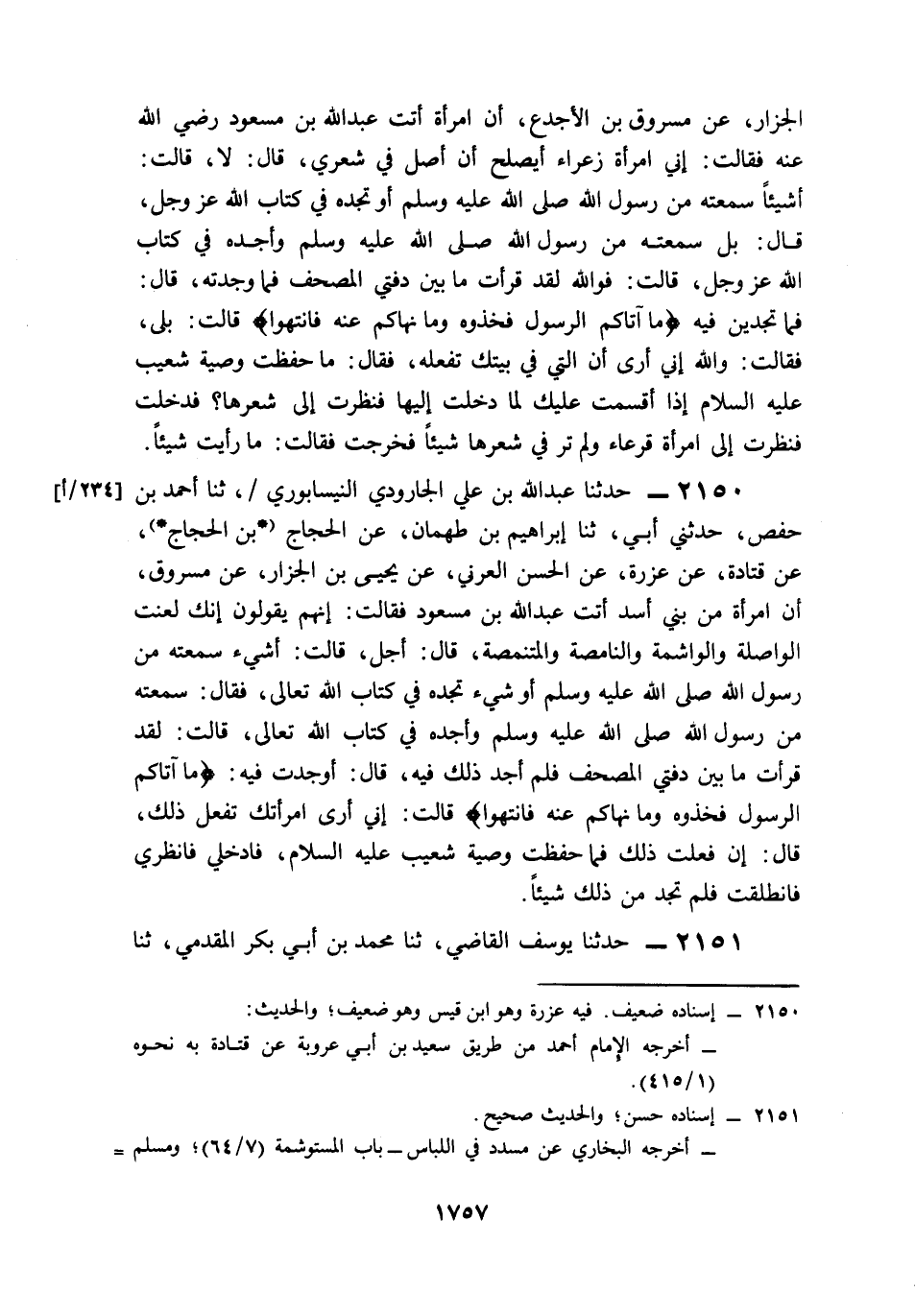 2150- حَدَّثَنَا عَبْدُ اللهِ بْنُ عَلِيٍّ الْجَارُودِيُّ النَّيْسَابُورِيُّ، حَدَّثَنَا أَحْمَدُ بْنُ حَفْصٍ، حَدَّثَنِي أَبِي، حَدَّثَنَا إِبْرَاهِيمُ بْنُ طَهْمَانَ، عَنِ الْحَجَّاجِ بْنِ الْحَجَّاجِ، عَنْ قَتَادَةَ، عَنْ عَزْرَةَ، عَنِ الْحَسَنِ الْعُرَنِيِّ، عَنْ يَحْيَى بْنِ الْجَزَّارِ، عَنْ مَسْرُوقٍ، أَنَّ امْرَأَةً مِنْ بَنِي أَسَدٍ أَتَتْ عَبْدَ اللهِ بْنَ مَسْعُودٍ فَقَالَتْ: إِنَّهُمْ يَقُولُونَ: إِنَّكَ لَعَنْتَ الْوَاصِلَةَ وَالْوَاشِمَةَ, وَالنَّامِصَةَ, وَالْمُتَنَمِّصَةَ؟ قَالَ: أَجَلْ, قَالَتْ: أَشَيْءٌ سَمِعْتَهُ مِنْ رَسُولِ اللهِ صَلى الله عَلَيه وَسَلم, أَوْ شَيْءٌ تَجِدُهُ فِي كِتَابِ اللهِ تَعَالَى؟ فَقَالَ: سَمِعْتُهُ مِنْ رَسُولِ اللهِ صَلى الله عَلَيه وَسَلم, وَأَجِدُهُ فِي كِتَابِ اللهِ تَعَالَى, قَالَتْ: لَقَدْ قَرَأْتُ مَا بَيْنَ دَفَّتَيِ الْمُصْحَفِ, فَلَمْ أَجِدْ ذَلِكَ فِيهِ، قَالَ: أَوَجَدْتِ فِيهِ: مَا آتَاكُمُ الرَّسُولُ فَخُذُوهُ وَمَا نَهَاكُمْ عَنْهُ فَانْتَهُوا؟ قَالَتْ: إِنِّي أَرَى امْرَأَتَكَ تَفْعَلُ ذَلِكَ، قَالَ: إِنْ فَعَلَتْ ذَلِكَ فَمَا حَفِظَتْ وَصِيَّةَ شُعَيْبٍ عَلَيْهِ السَّلاَمُ، فَادْخُلِي فَانْظُرِي، فَانْطَلَقَتْ, فَلَمْ تَجِدْ مِنْ ذَلِكَ شَيْئًا.